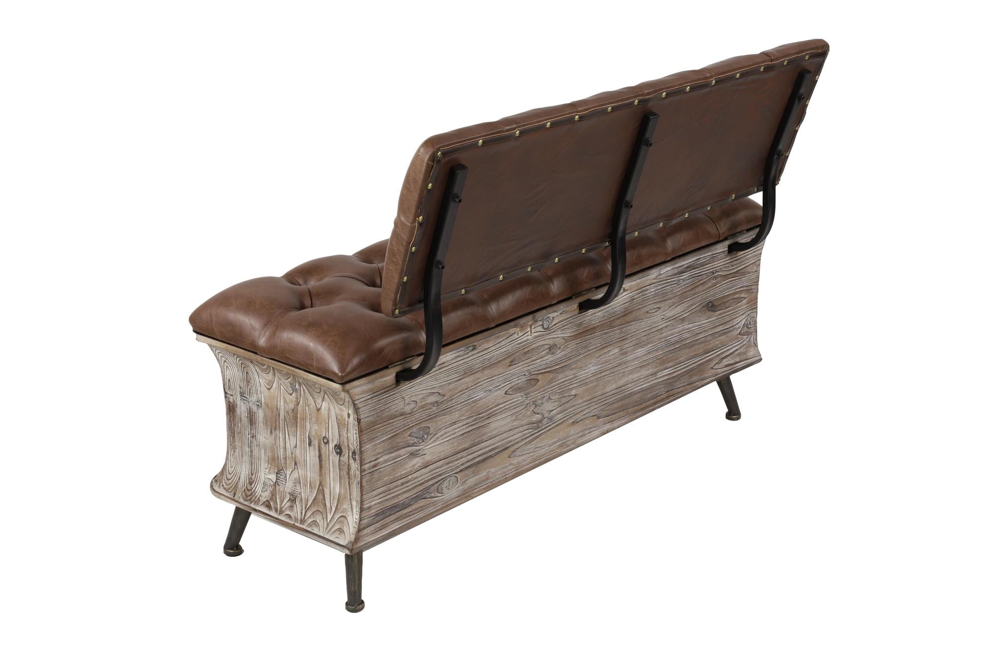 •This rustic entryway storage bench is constructed with a concave cut compartment under the leather seat