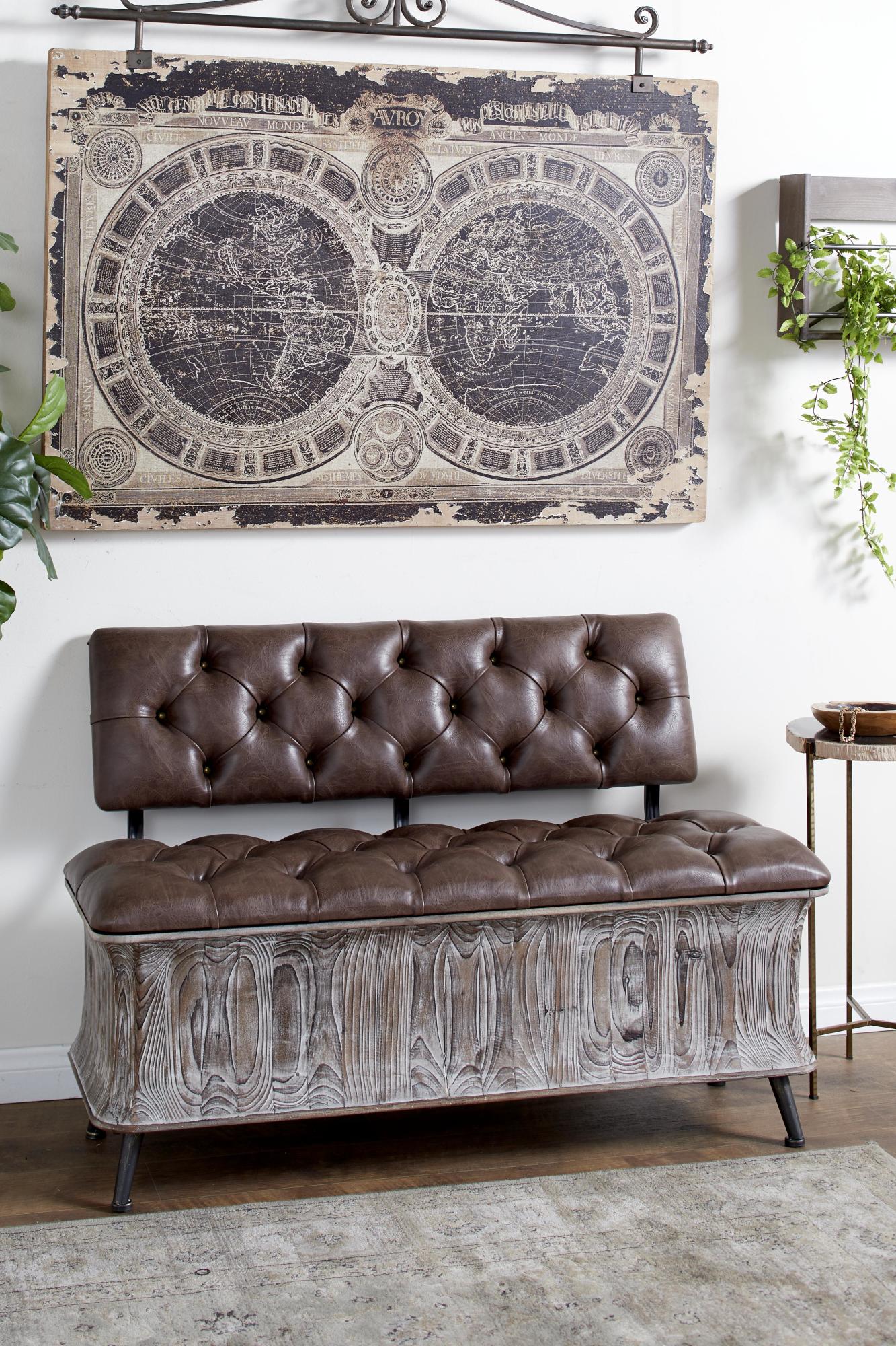 Brown Wood Room Storage Bench with Tufted Faux Leather Seat and Back