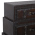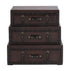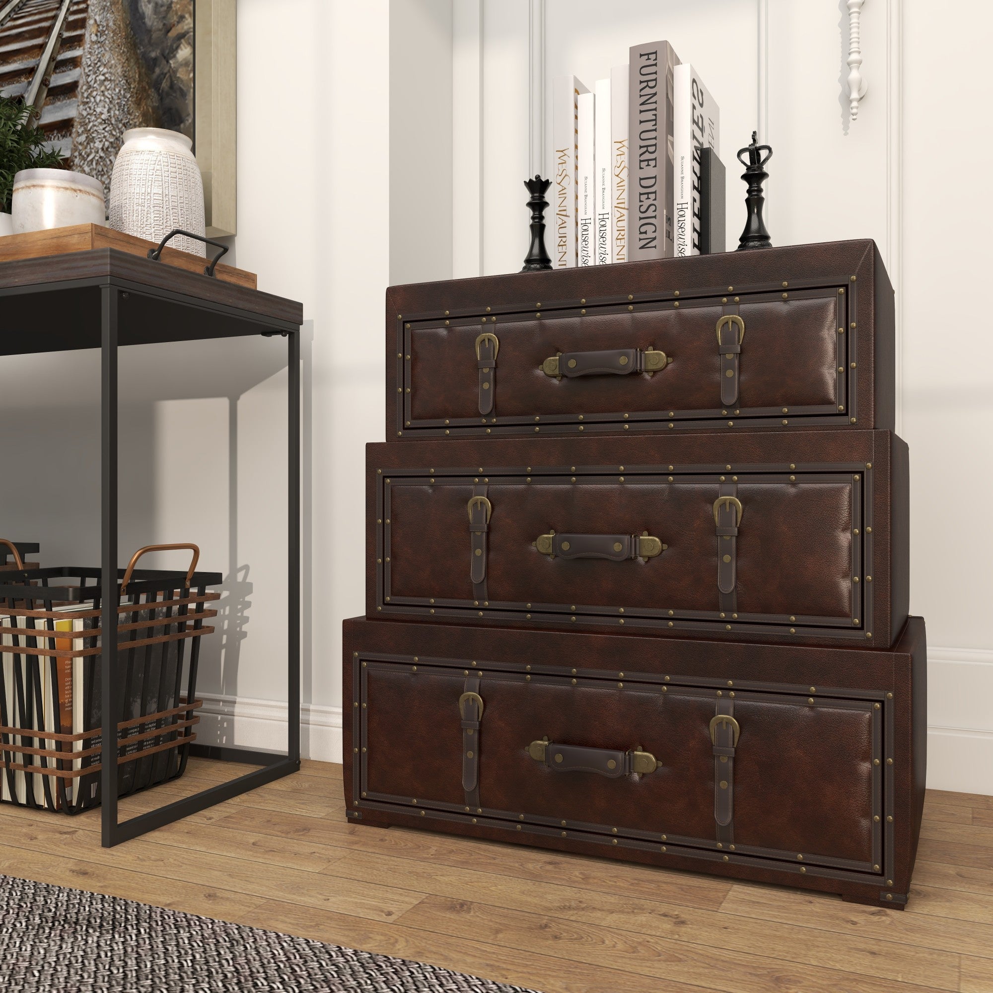 •This plywood chest features three varying size drawers, each detailed with faux leather buckle straps, bolted handles, and rivets for an authentic touch