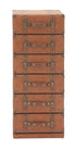 •This wood chest boasts a rectangular-shaped cabinet drawer with six compartments, accompanied by suitcase belt handles for an added touch of uniqueness