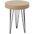 •The MDF accent table features an attractive round top displaying natural wood graining, supported by three distinctively styled hairpin legs