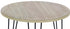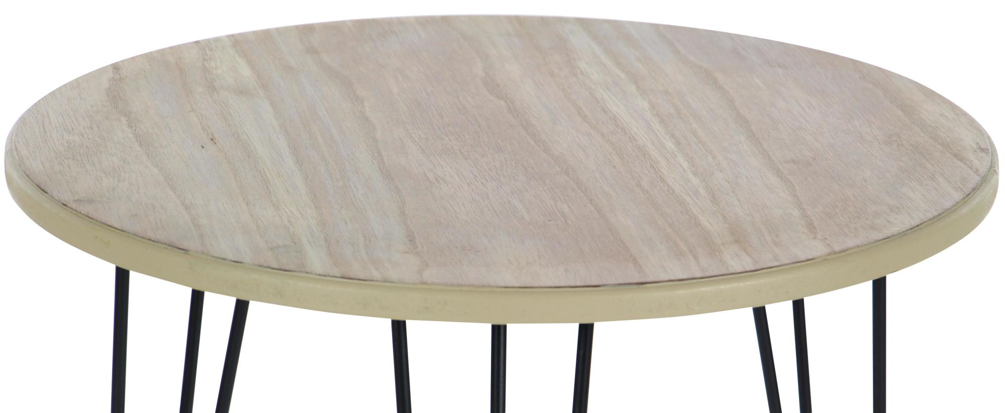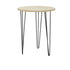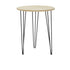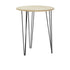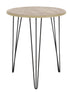 •Wood accent table features a round top with natural wood graining, supported by three hairpin-style legs for added stability