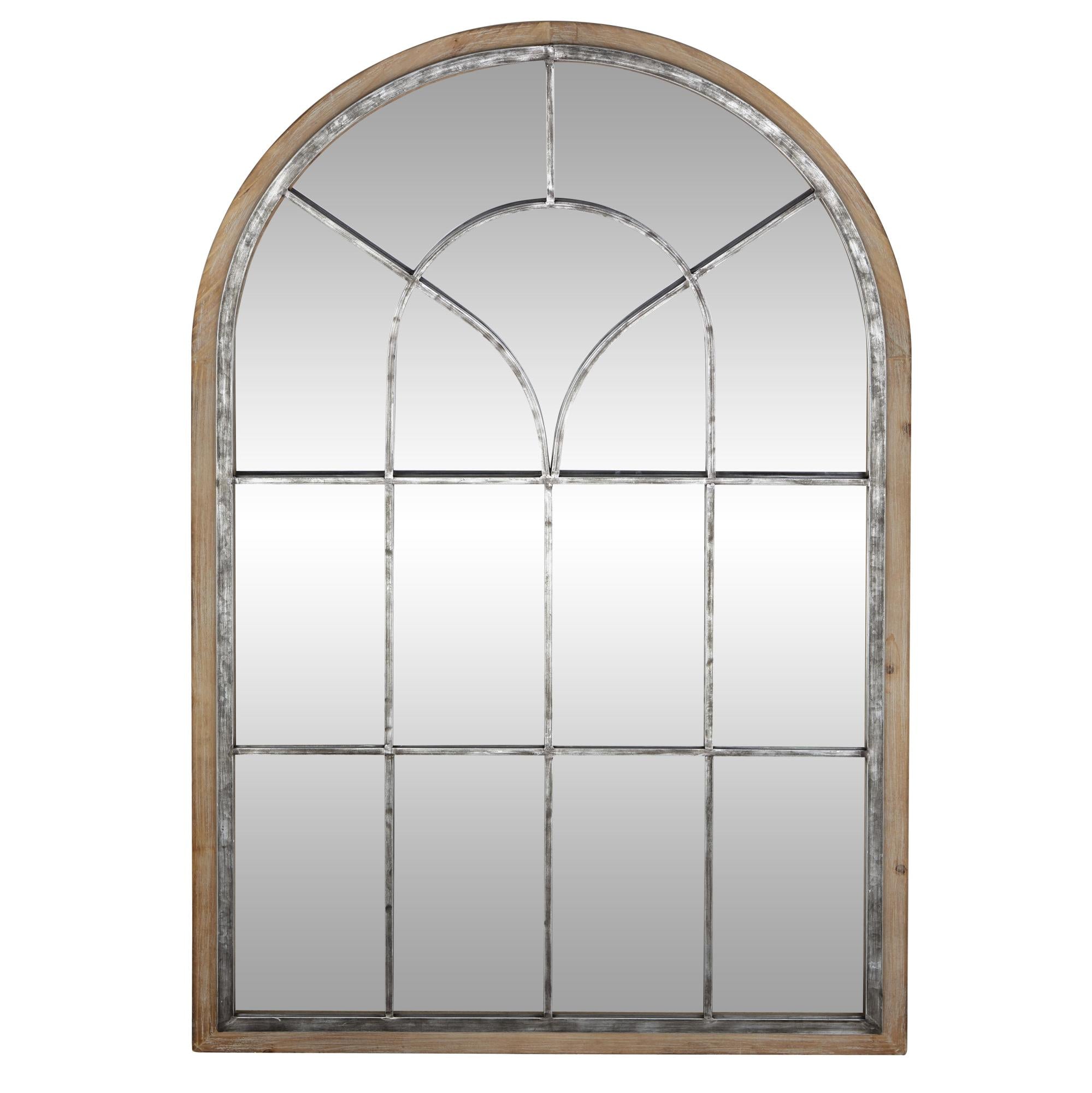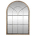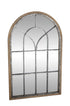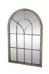•The distressed mirror for wall has an interesting shape and arching windowpane design complemented by some rectangular window panels