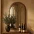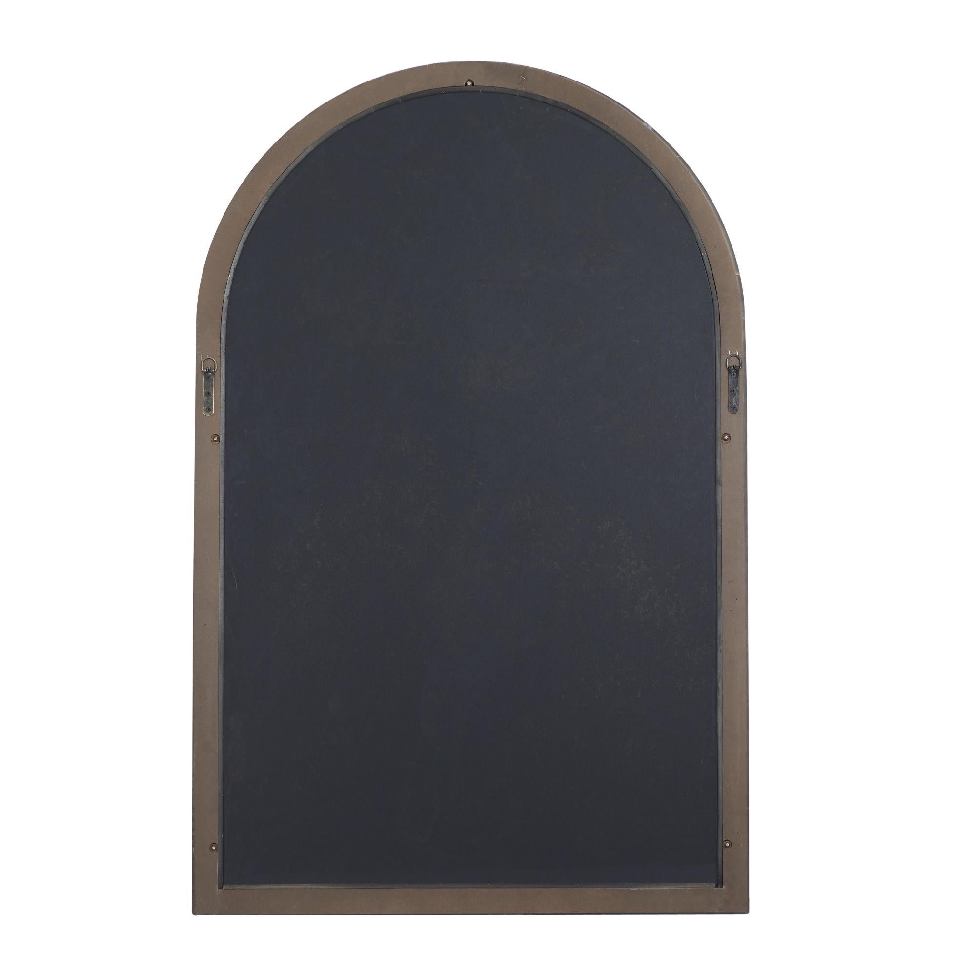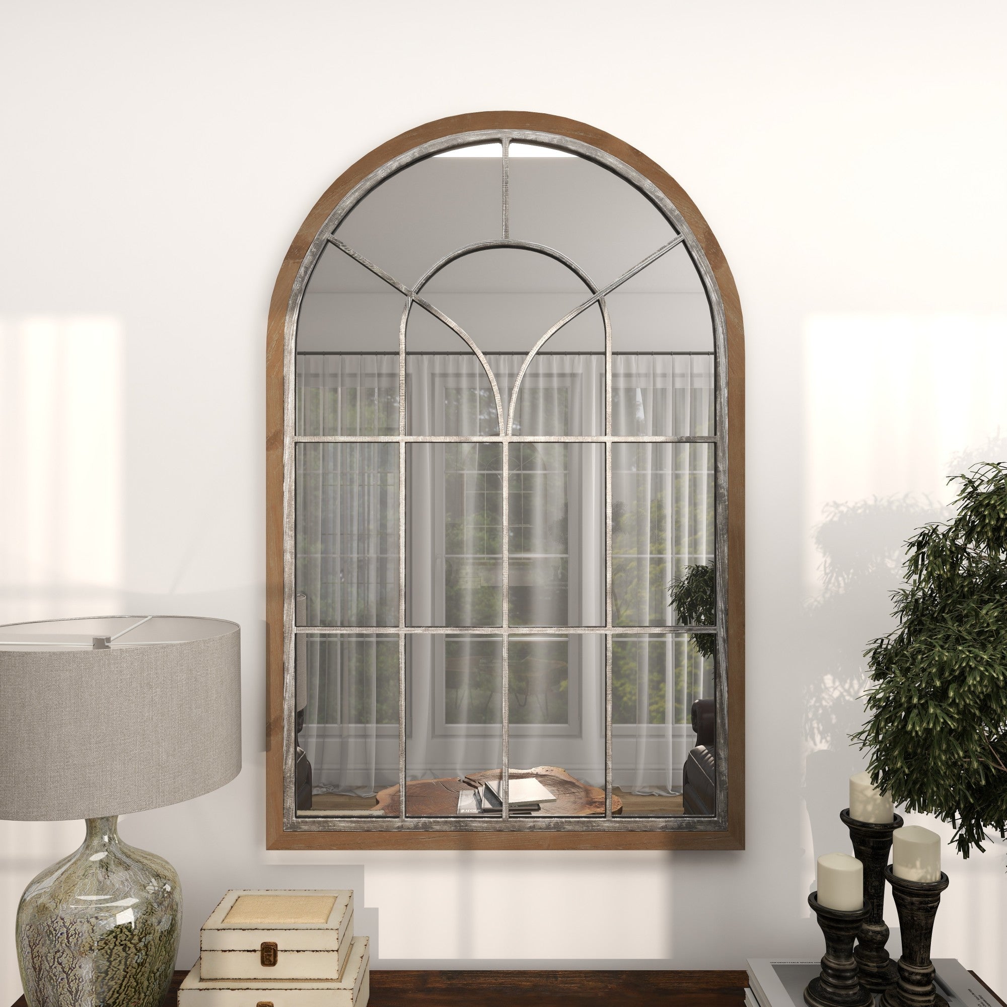 •The wood wall mirror features a farmhouse-inspired design, complete with an arching window profile and distressed paint finishing