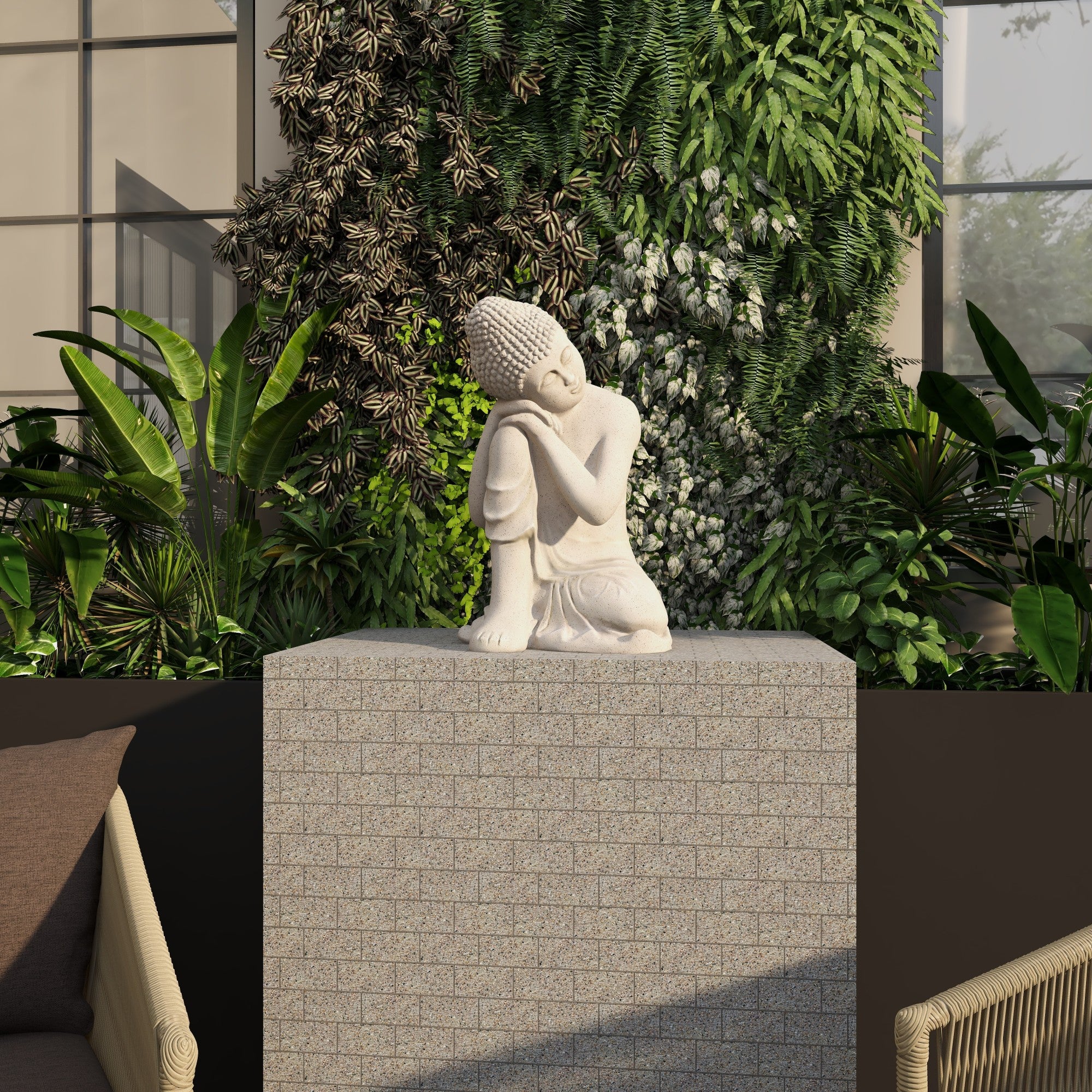 •The unique design of this magnesium oxide garden sculpture features a meditating Buddha with its head resting on its right knee