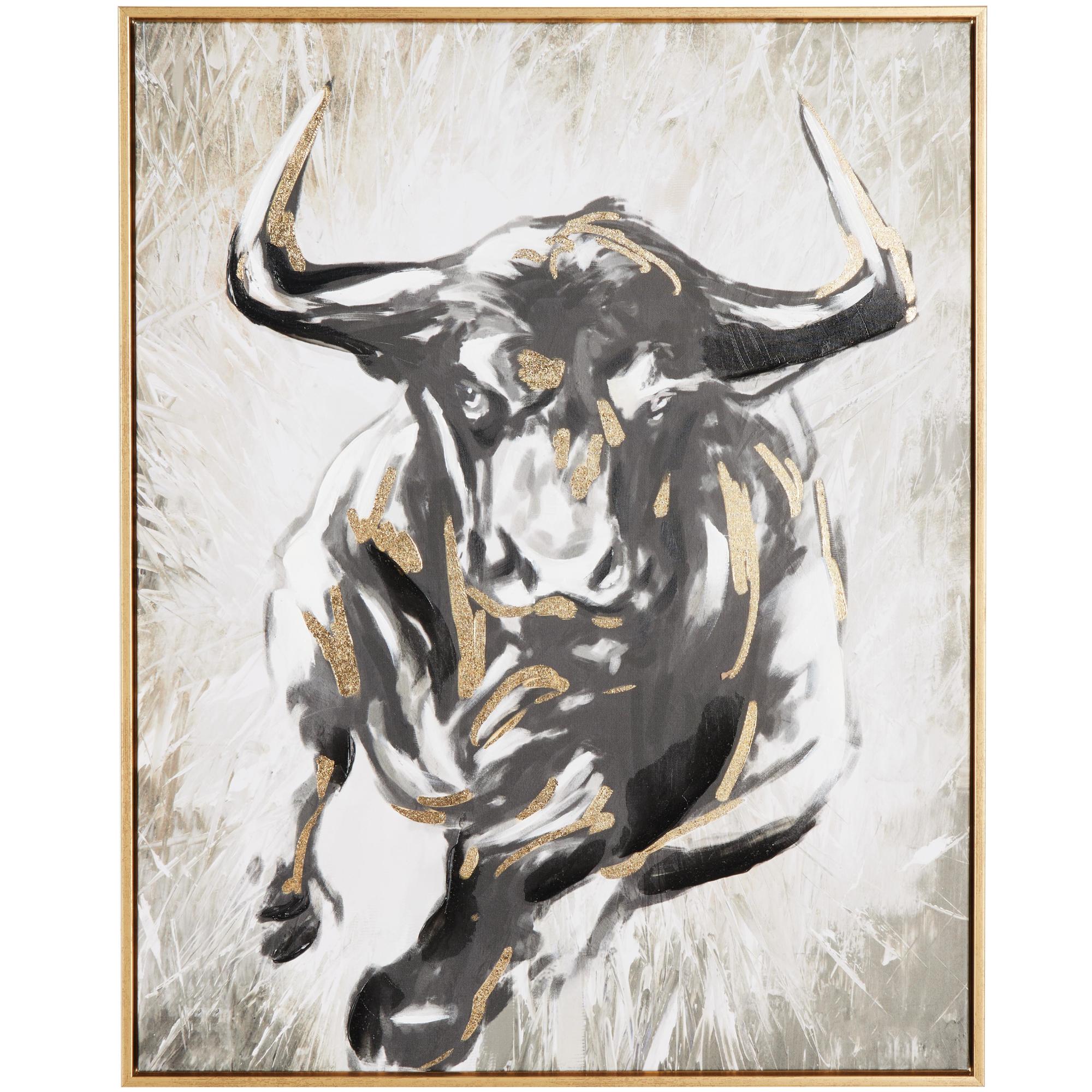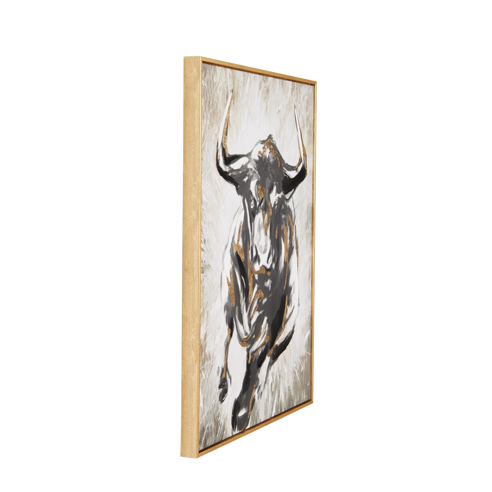 •The canvas framed wall art features a textured design of a bull in mid-run, adorned with foil accents that will make an impression in any space