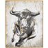 •The textured wall framed art highlights a rectangular canvas featuring a running bull