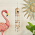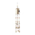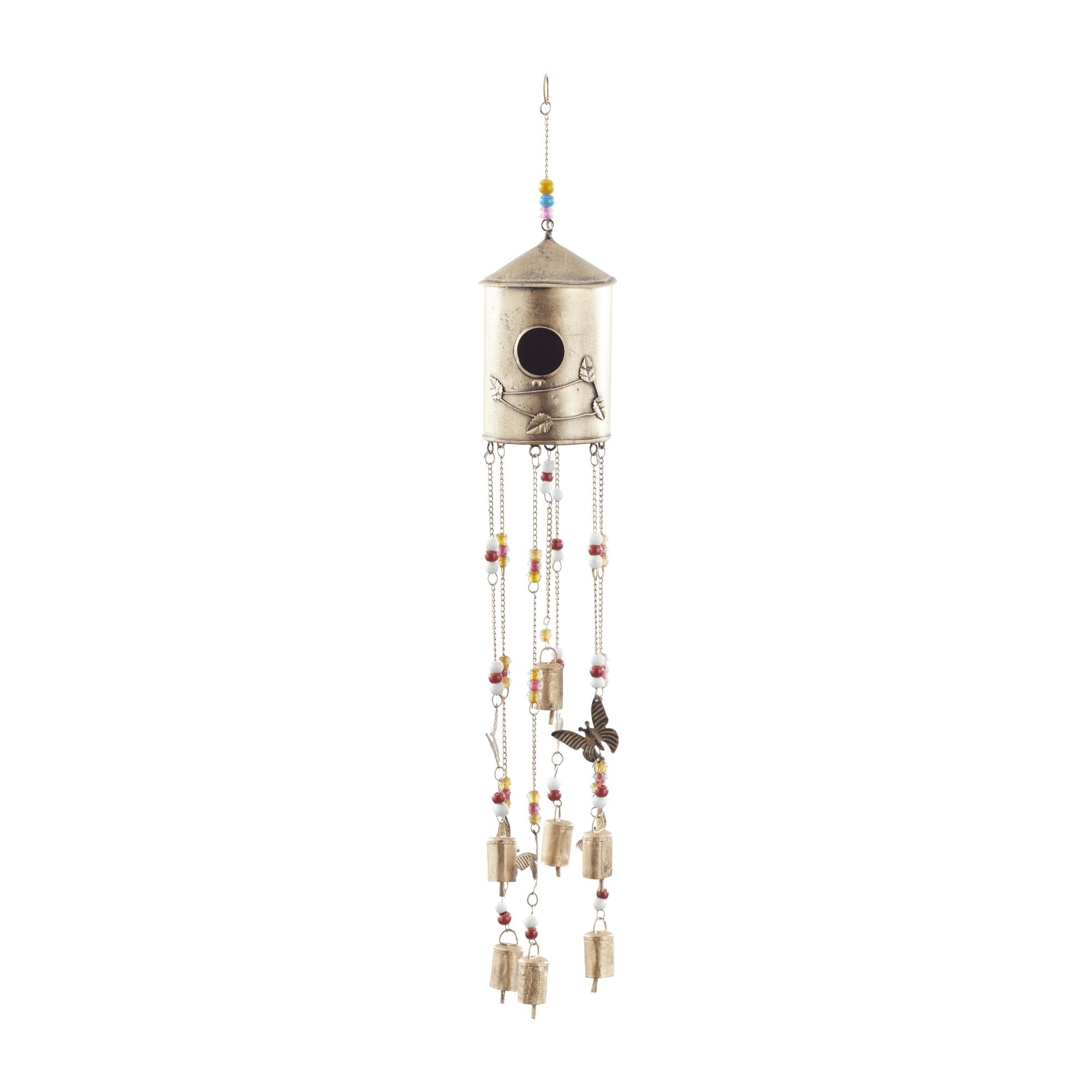 •This weathered windchime for home features a birdhouse shape adorned with leaf patterns, round beads, butterfly accents, and cylindrical bells