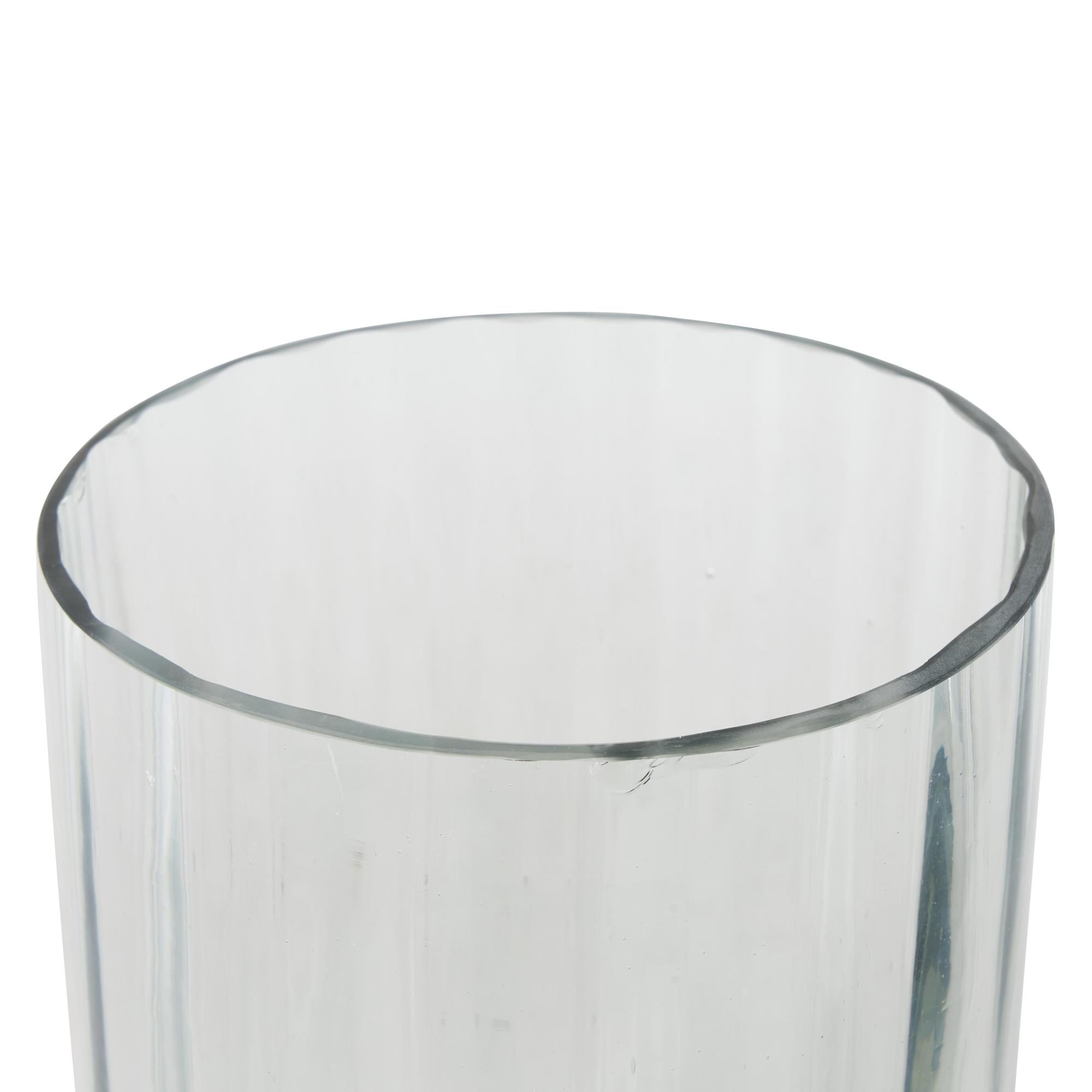 •This modern candle holder for home decor is molded from blown glass, ribbed on the body, and has an elevated base