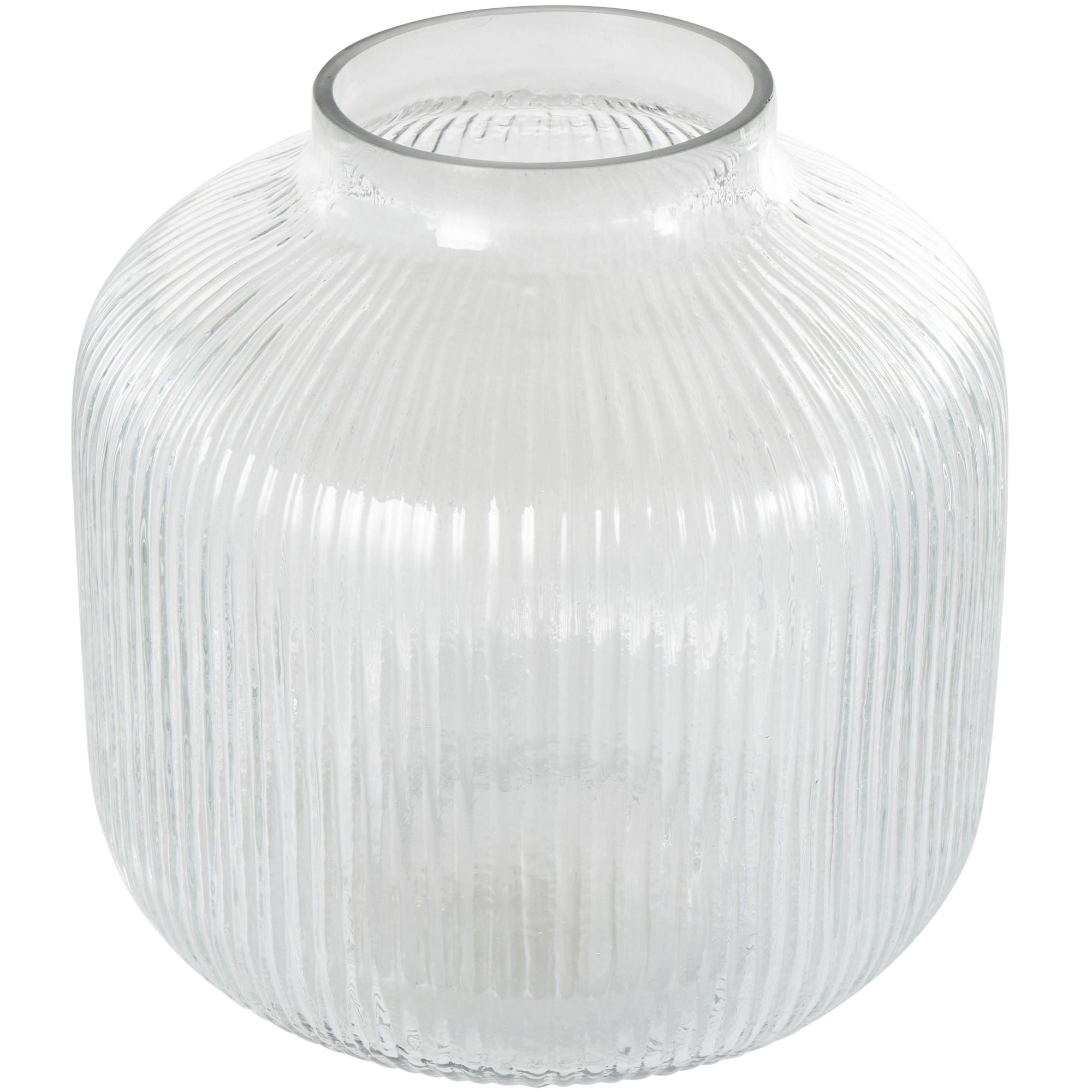 •This glass vase boasts a short round shape and ribbed design that adds texture and elegance