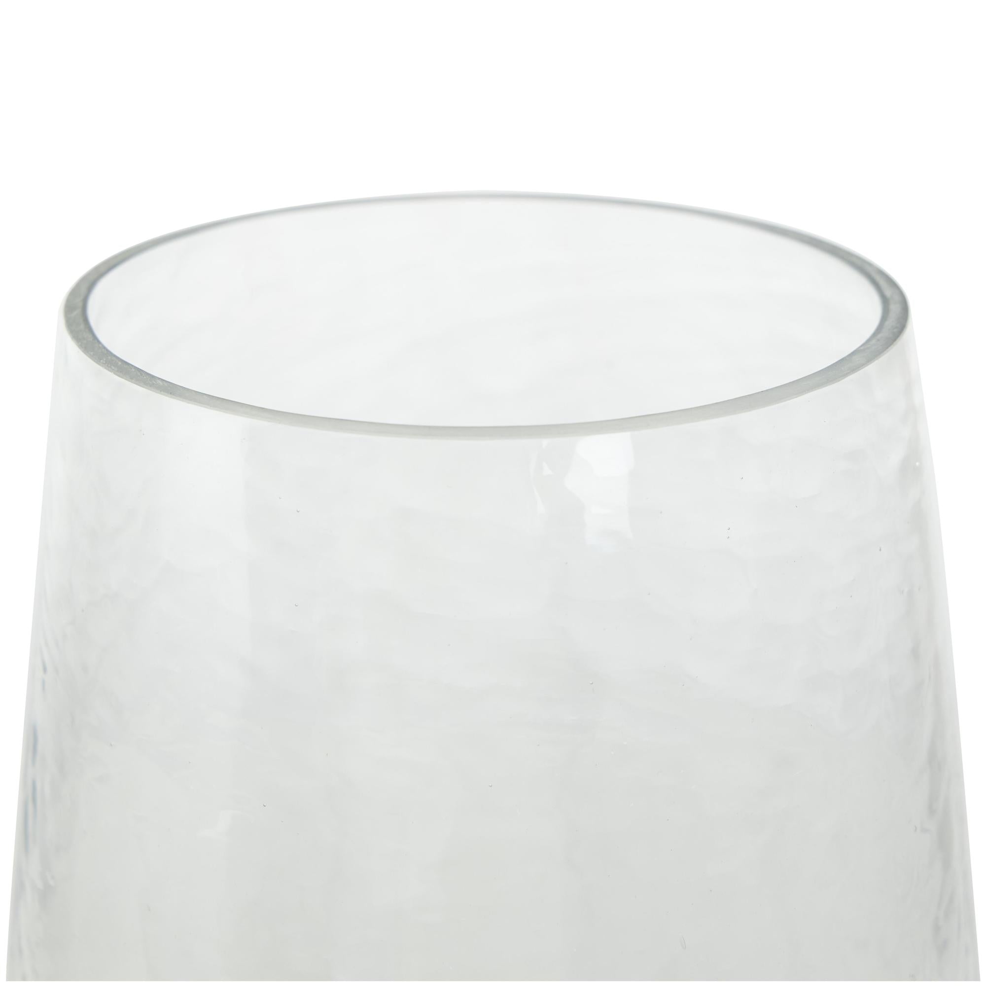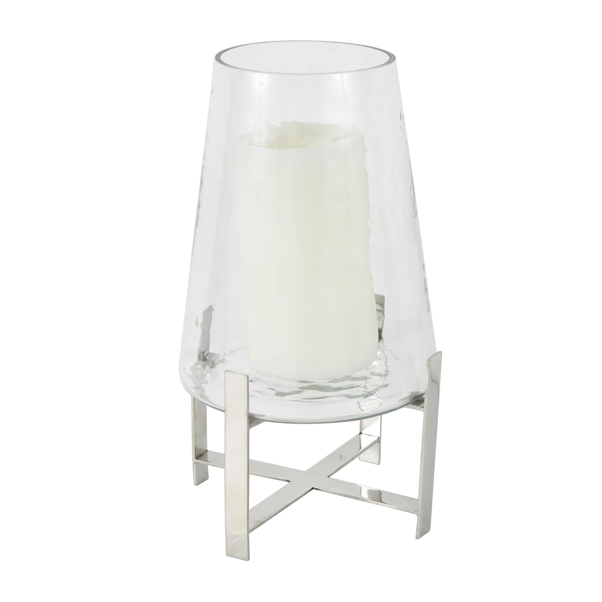 •The polished hurricane glass candle holder features a tapered cylindrical shape atop an X-shaped base with four legs, offering a modern aesthetic