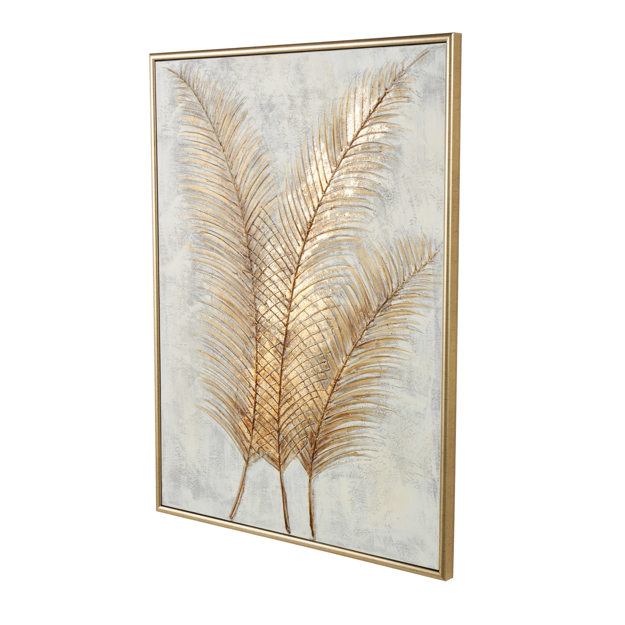 •This canvas framed wall art showcases three large palm fronds with a low relief feature, adding dimensional layers