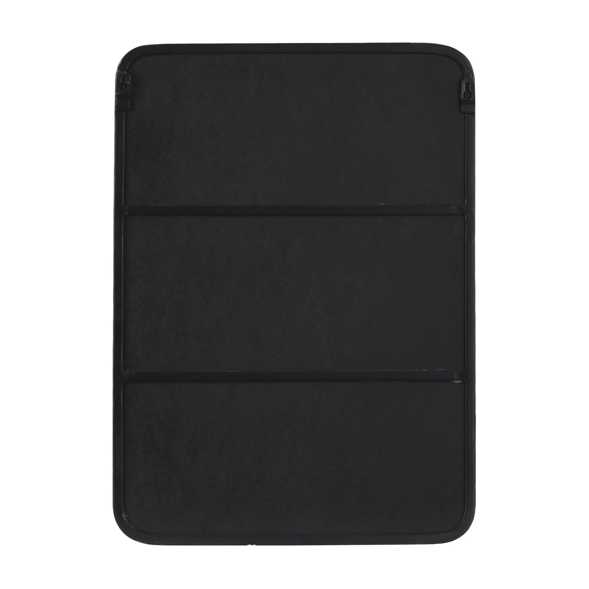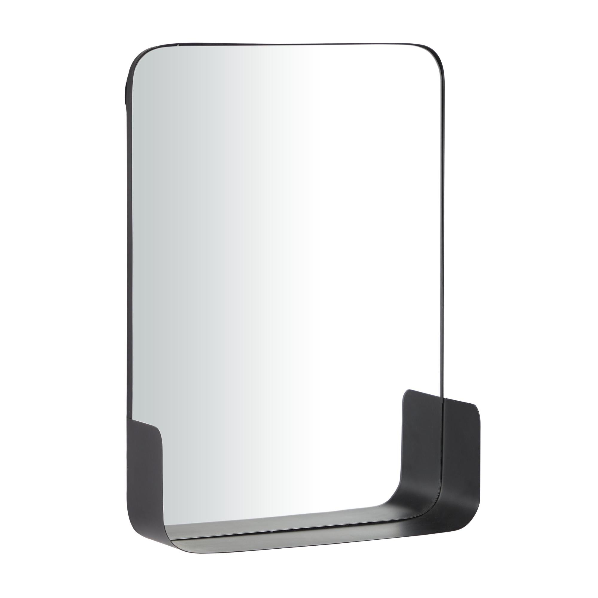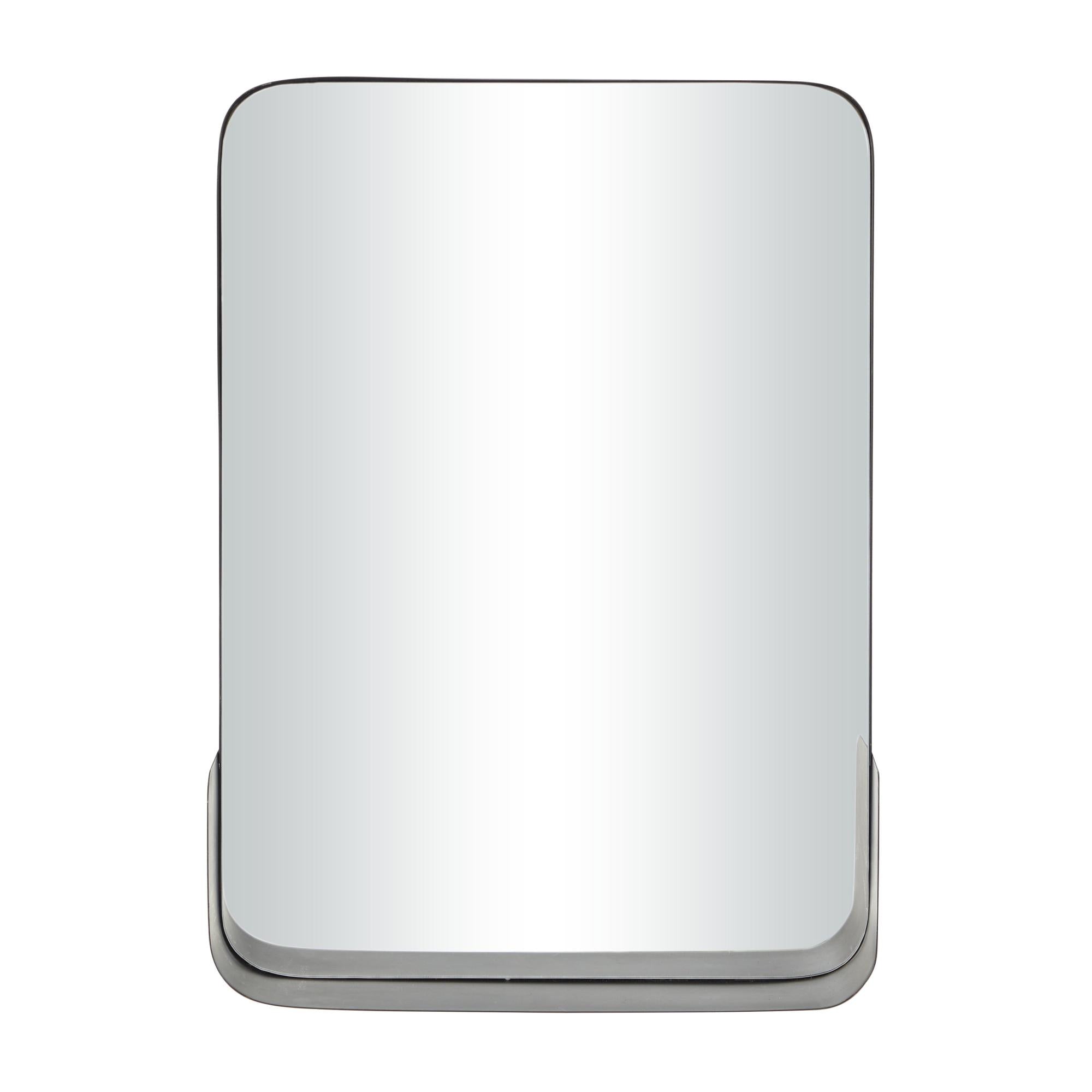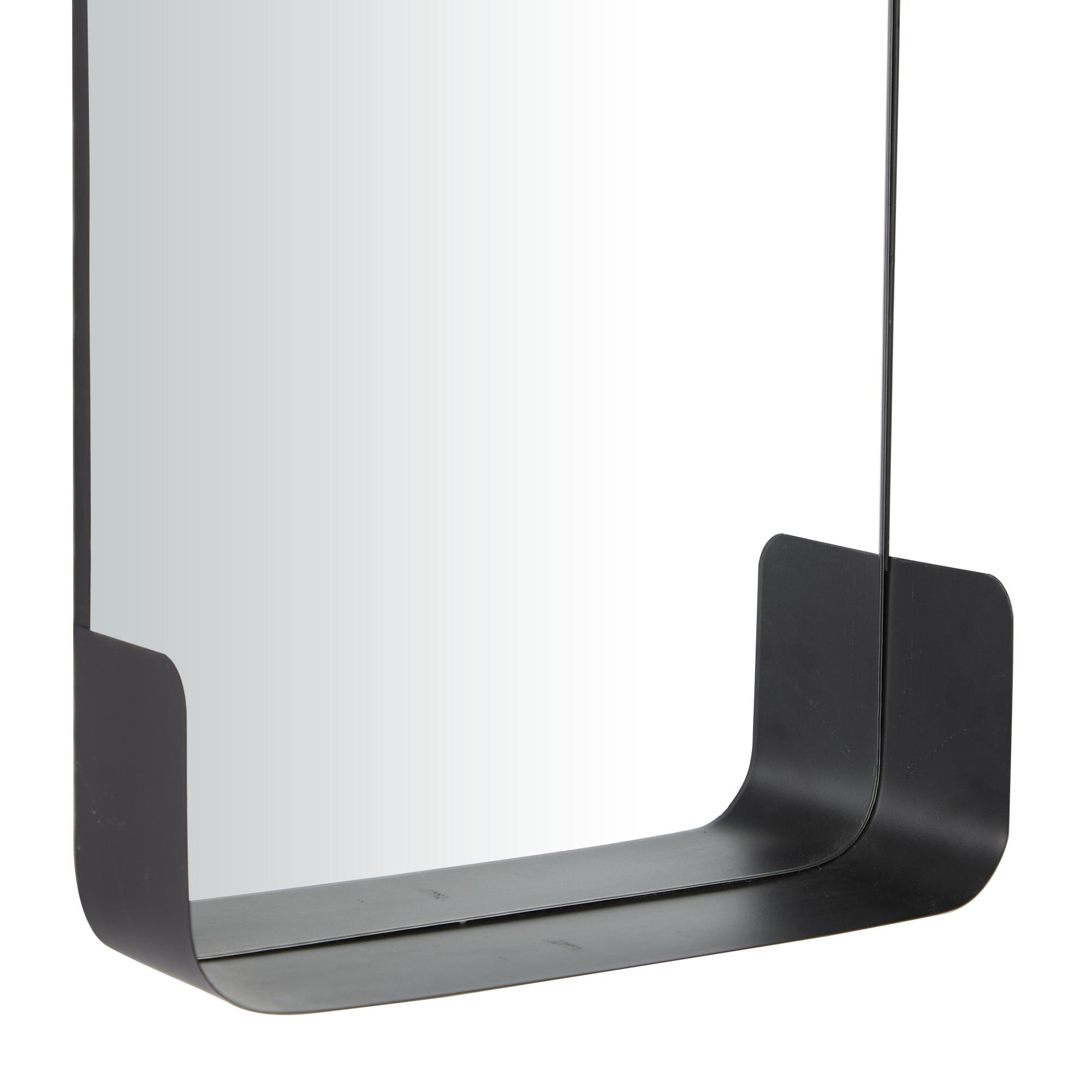 •The metal wall mirror features a reflective rectangular glass panel with curved edges enclosed in a solid metal frame with a wide lower lip
