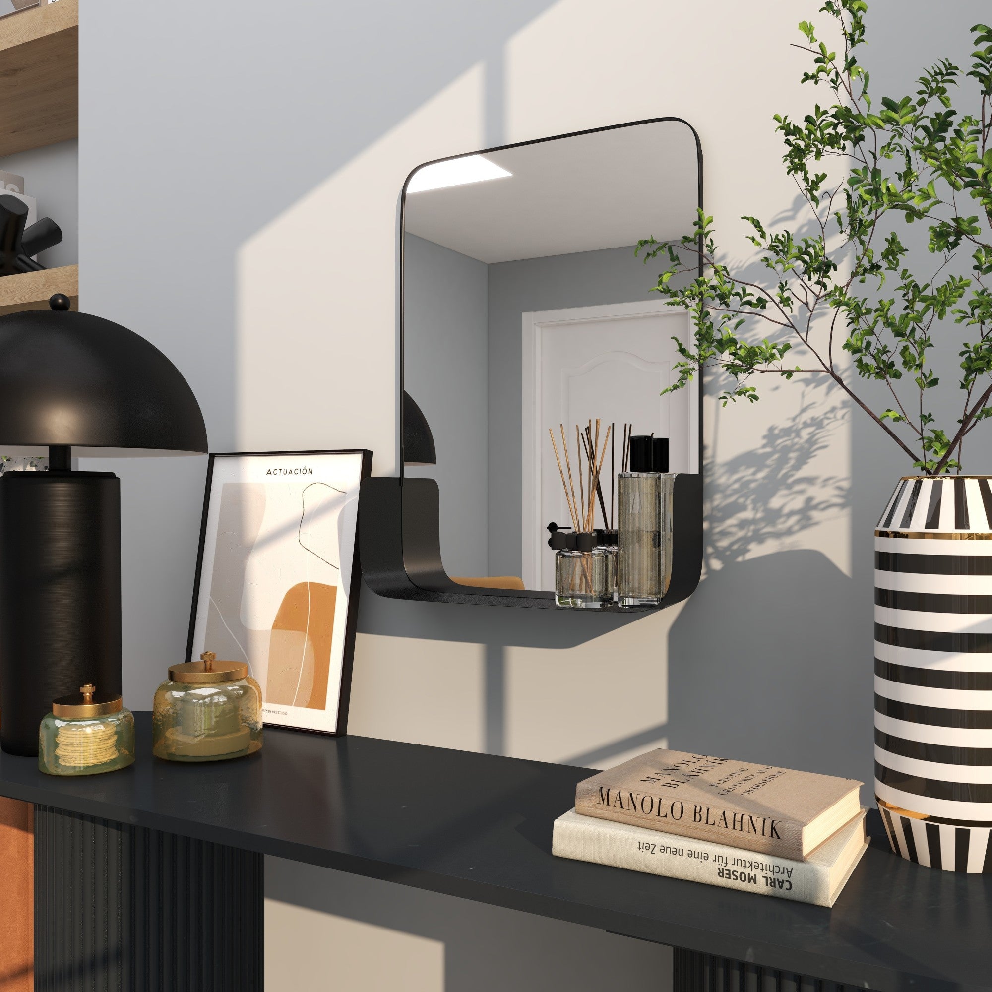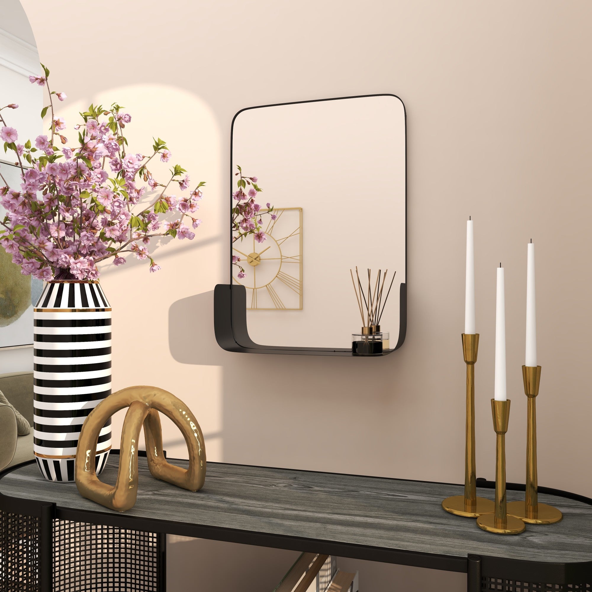 •The modern accent wall mirror features a rectangular structure and a shelf at the bottom