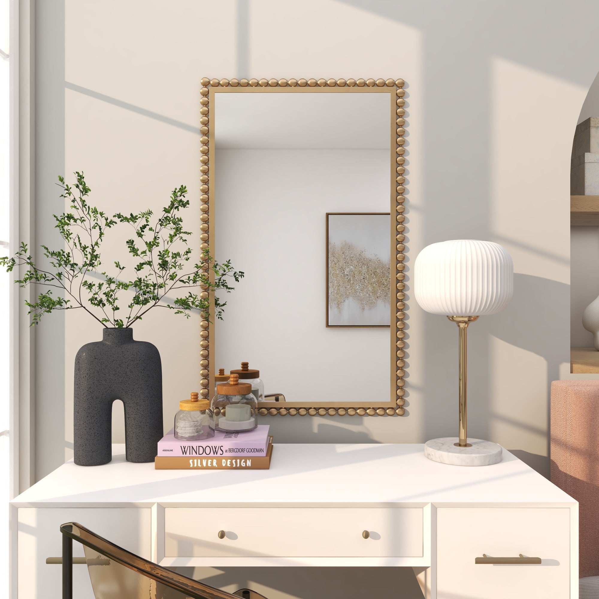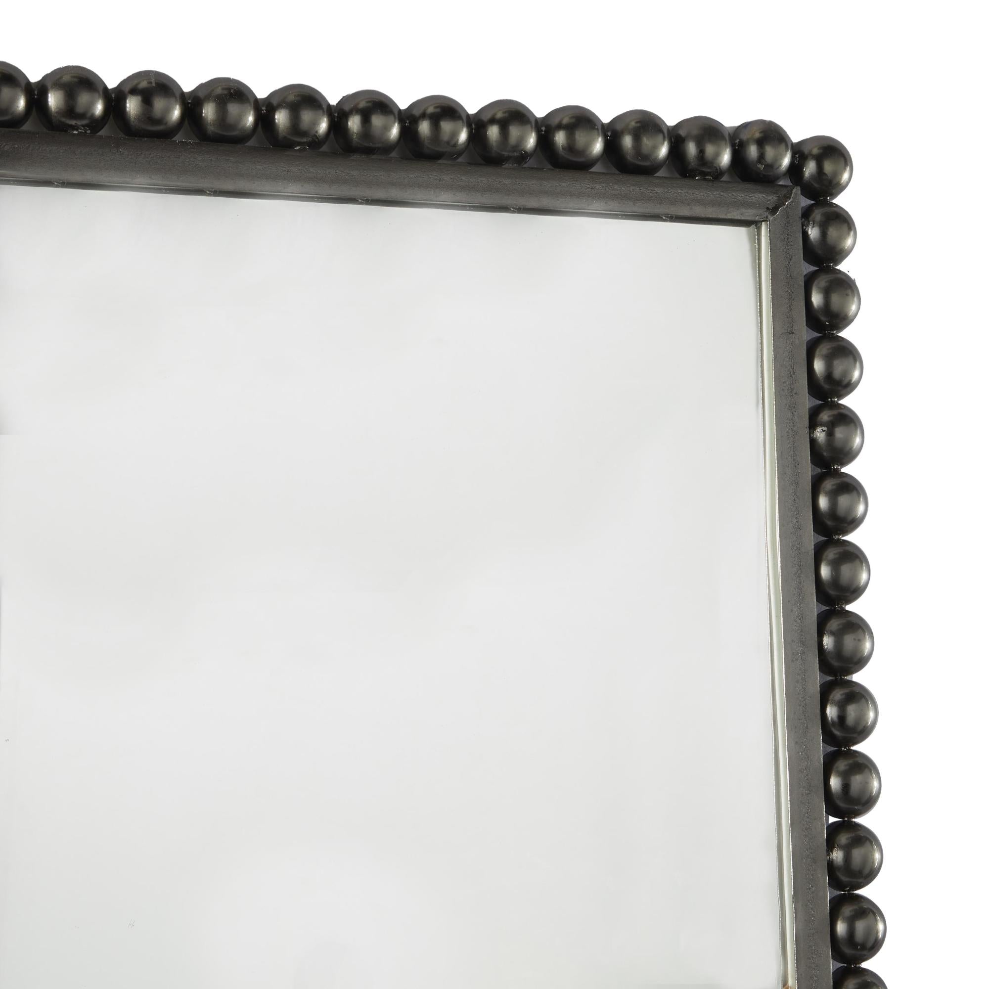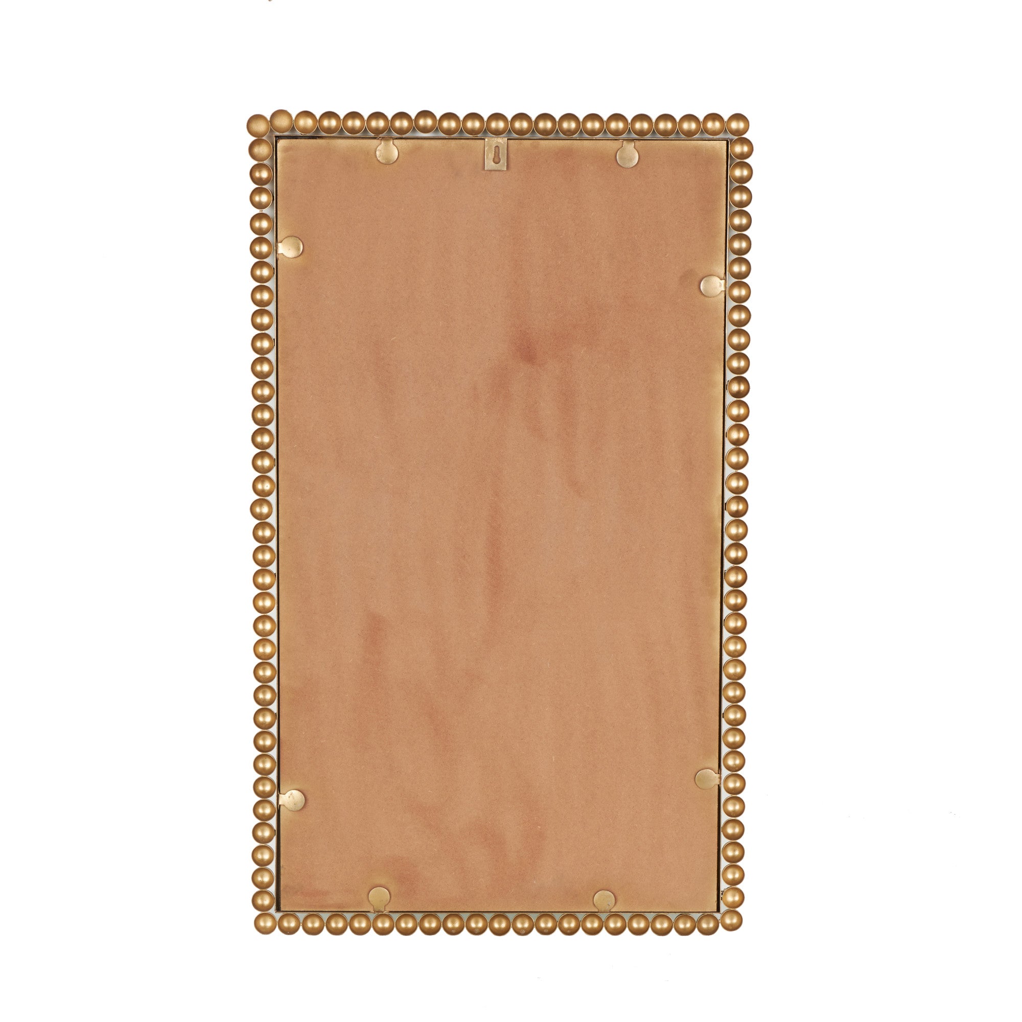 •This metal wall mirror showcases an opulent beaded metal frame with a reflective rectangular glass panel