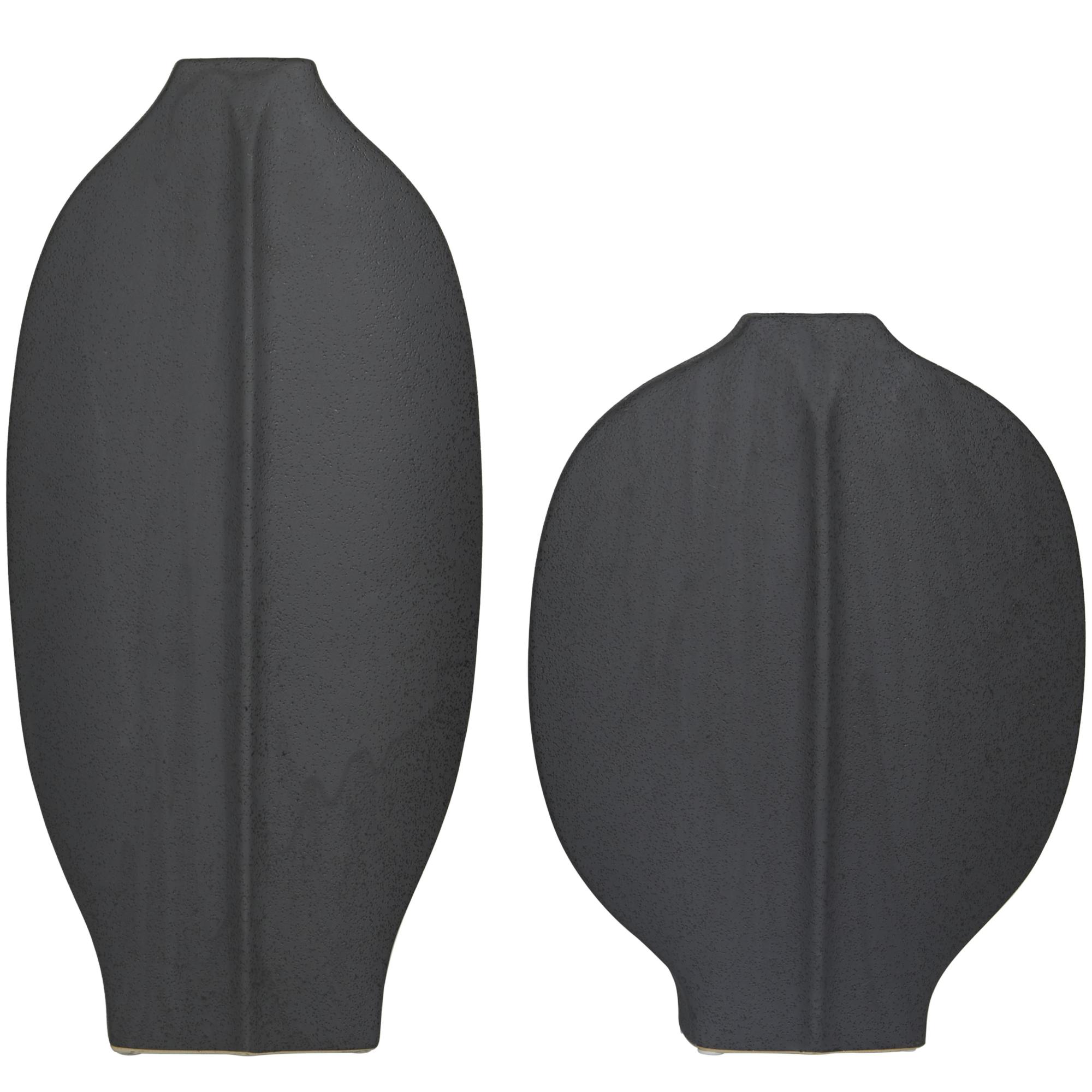 Fill this set of 2 centerpiece vases with dried flowers, branches, and foliage for a beautiful display on your console table. Designed with felt or rubber stoppers at the base that prevent scratching furniture and table tops, as well as sliding around. This item ships in 1 carton. Suitable for indoor use only. This item ships fully assembled in one piece. This stoneware vase comes as a set of 2. Modern style. Vases have 1 in, and 0.80 in mouth openings.