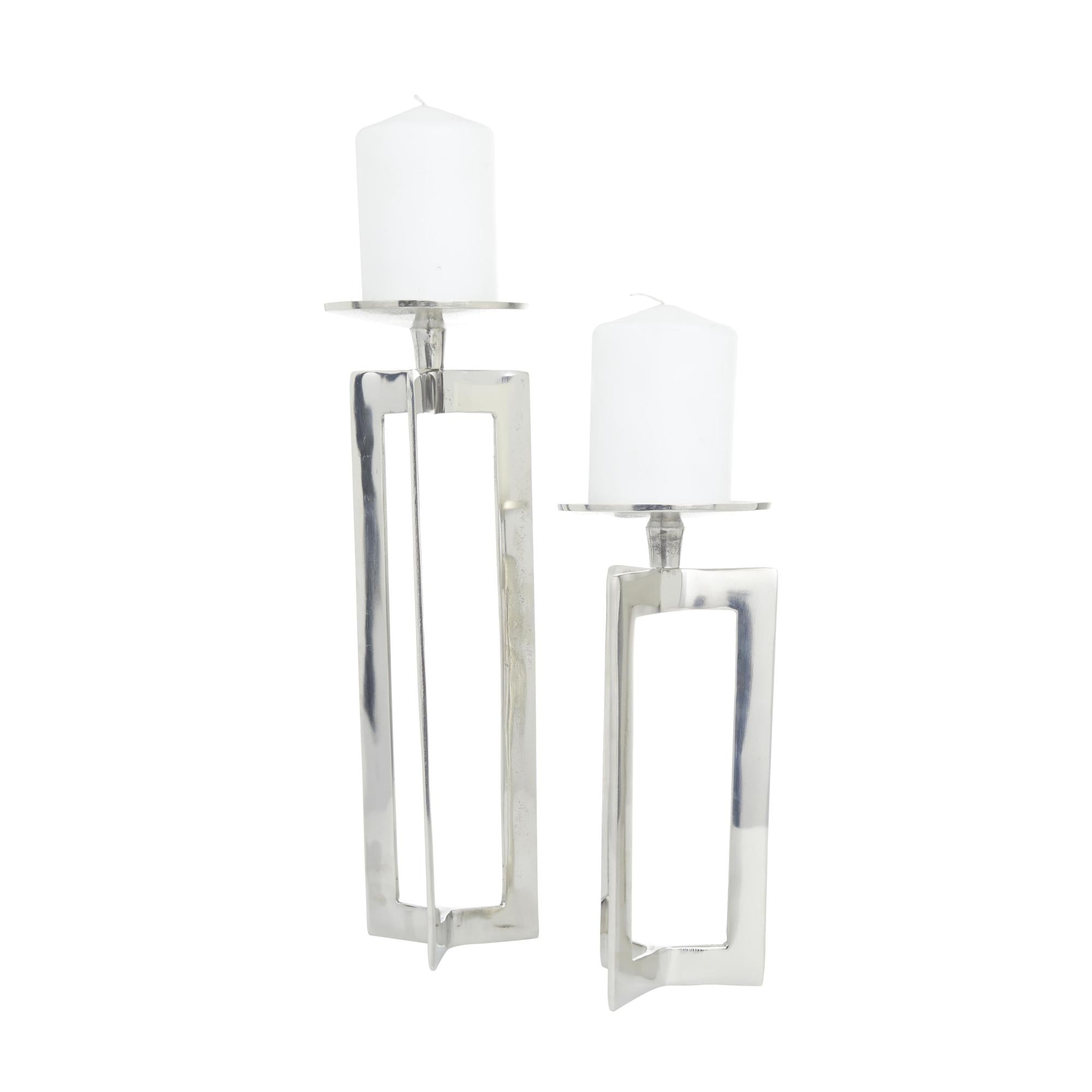 Give your space a radiant illumination with these beautifully crafted candle holders. Made with a sturdy base, it is perfect for creating an elegant atmosphere at your table top or mantel. Show off this geometric set of 2 candle stands in your entryway, living room, dining area, study room, or bedroom for an elevated aesthetic. Can hold 2 pillar candles, not included. This item ships in 1 carton. Aluminum candle holder makes a great gift for any occasion. Suitable for indoor use only. This item ships fully assembled in one piece. Made in India. This aluminum candle stand comes as a set of 2. Contemporary style.