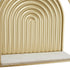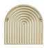 •Satin room floating shelves feature an arched metal frame with a ribbed pattern, complemented by rectangular wooden slats
