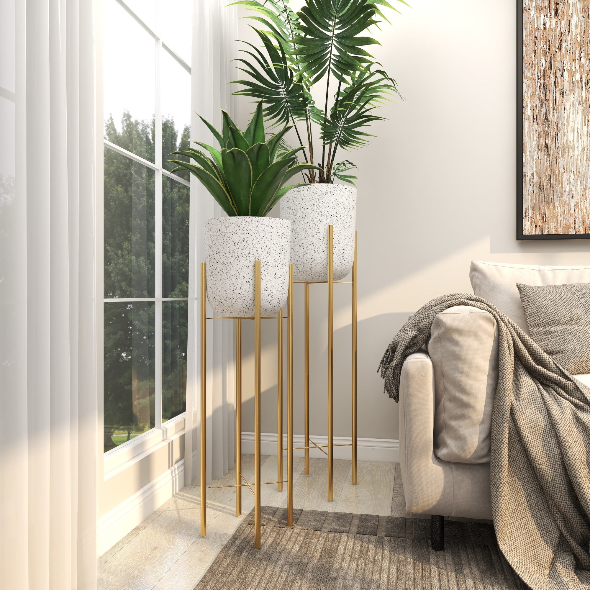 set of 2 large planter pots would look stunning in a variety of settings, including patios, living rooms or office spaces. This item ships in 1 carton. Please note that this item is for decorative purposes only and is not food safe. Suitable for indoor and outdoor use. This item ships fully assembled in one piece. Maximum weight limit is 5 lbs. Made in India. Planters do not have drainage holes but they are not watertight. This metal plant pot comes as a set of 2. Glam style.