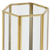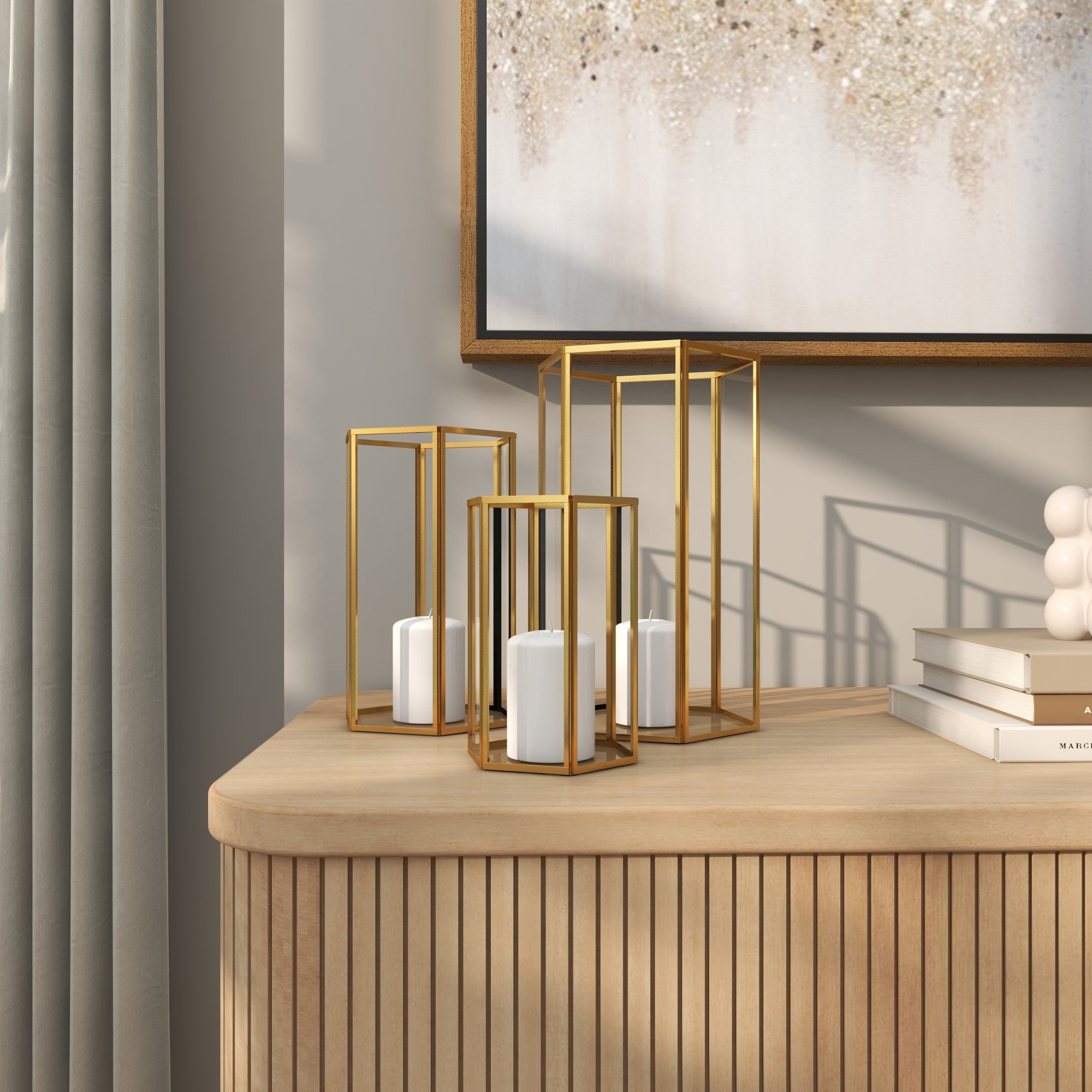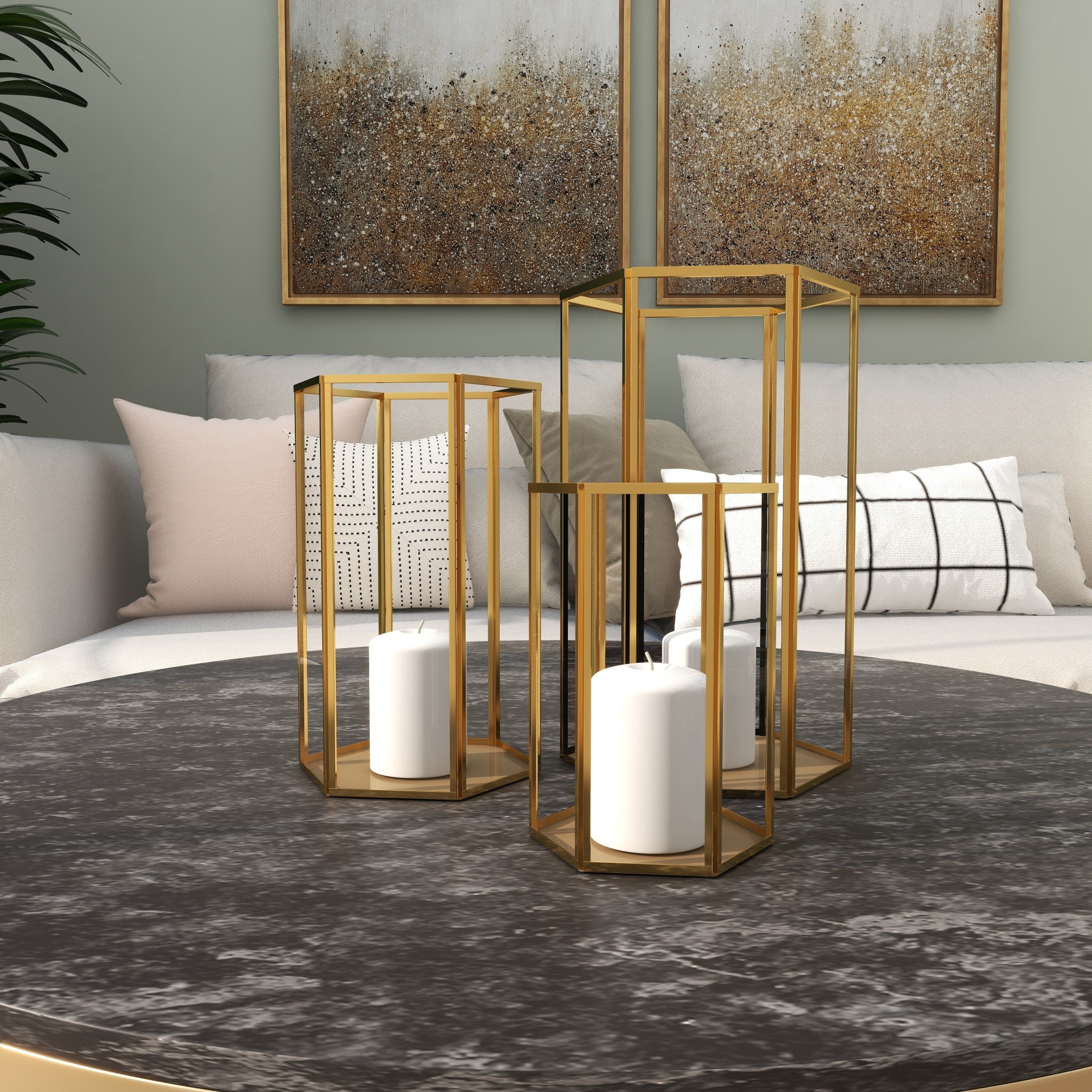 •Modern glass set of 3 candle lanterns features hexagon-shaped bodies with metallic rims, adding a touch of elegance