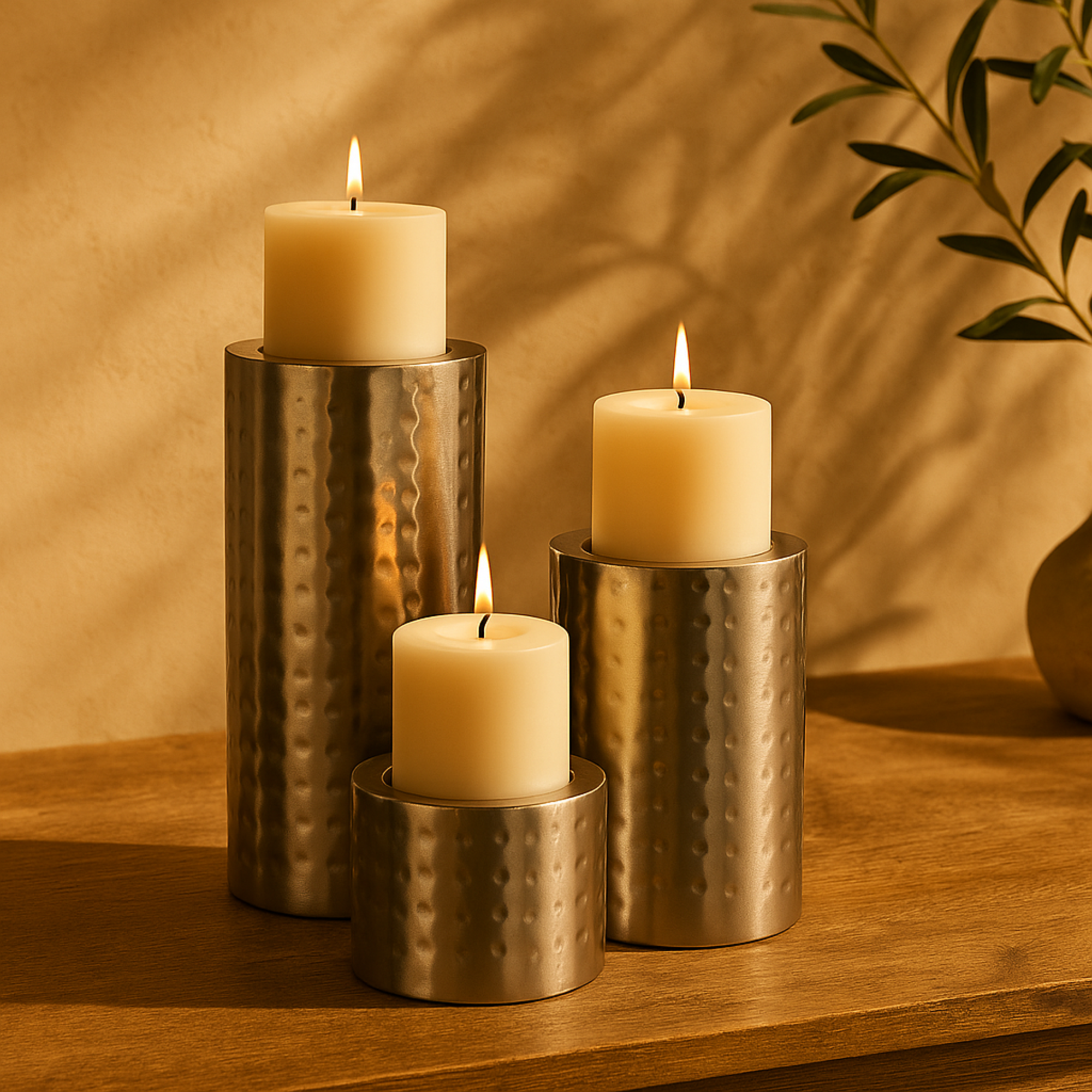 •Metal set of 3 candle holders features unique hammered indentations encasing the multi-level round bodies for added texture