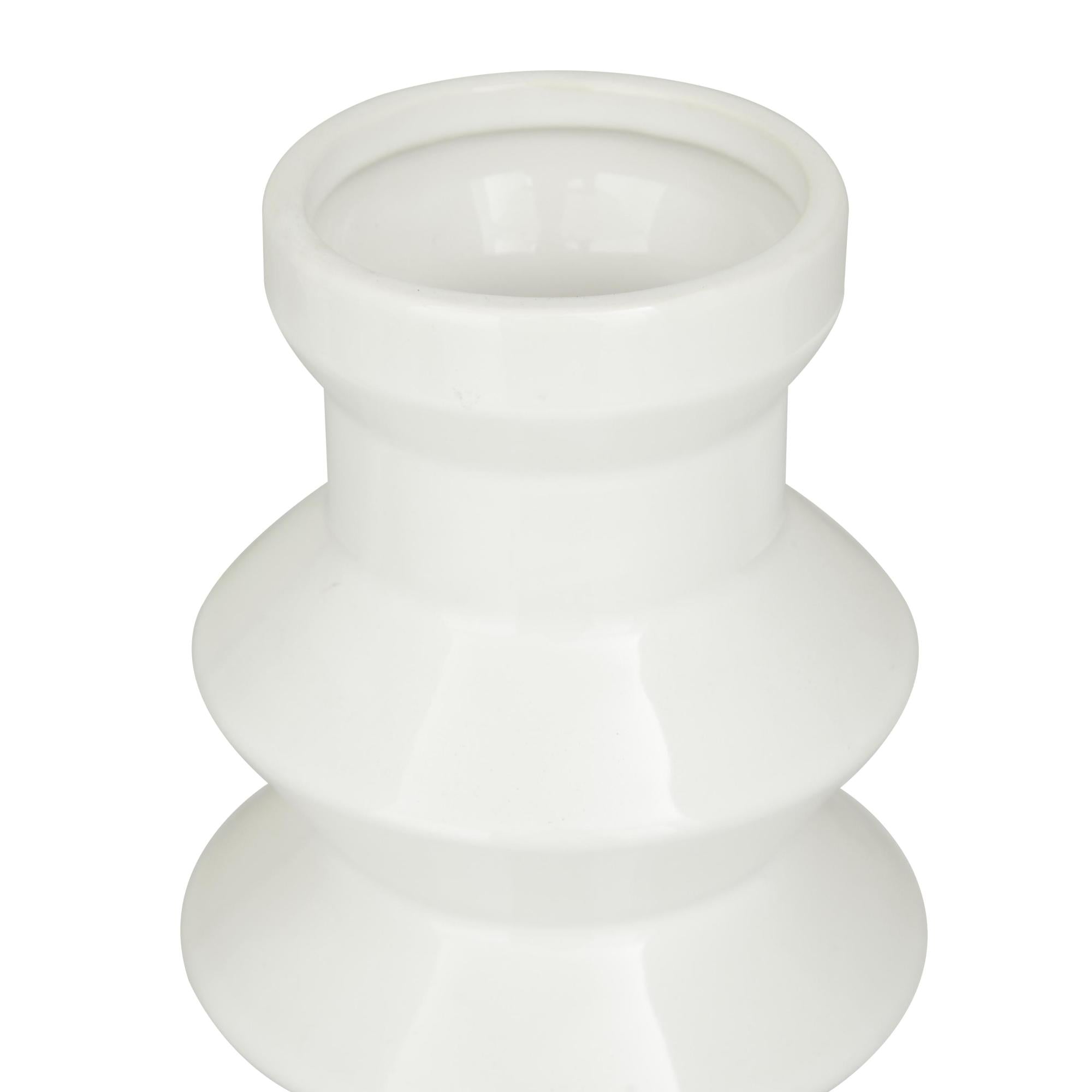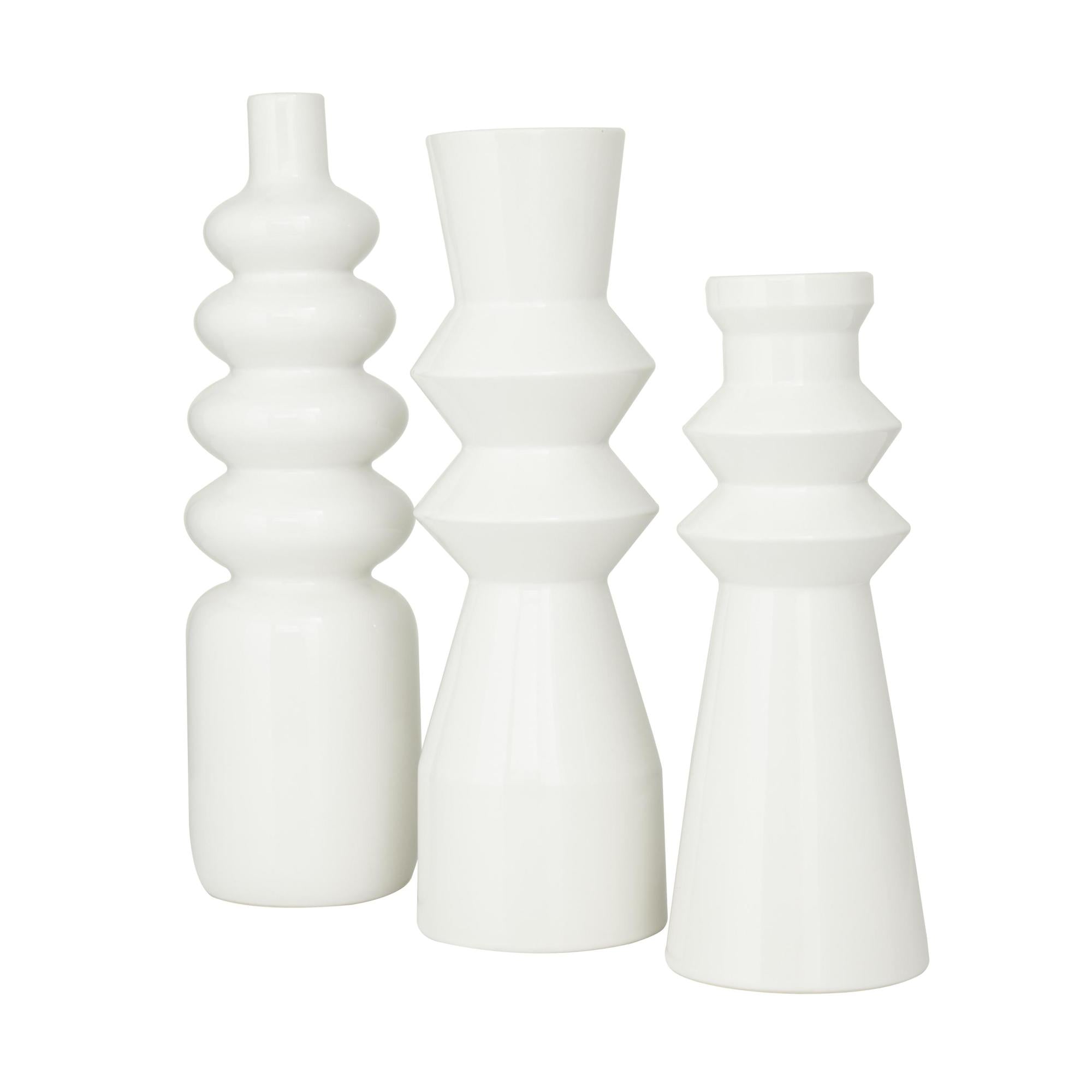 This vase is perfect for displaying orbs filler and twigs, as well as filling up any negative space against an open surface space. Create depth and form onto your space by displaying this beautifully crafted vase. The set of 3 centerpiece vases makes an instant statement piece on a metal or wooden accent table, offering both style and functionality. Designed with felt or rubber stoppers at the base that prevent scratching furniture and table tops, as well as sliding around. This item ships in 1 carton. Suitable for indoor use only. This item ships fully assembled in one piece. This stoneware vase comes as a set of 3. Contemporary style. Vases have 2.25 in, 1.25 in, and 2 in mouth openings.