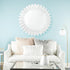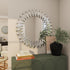 •The glass wall mirror is characterized by a round structure adorned with a brick-style sunburst patterned frame, making it a standout feature