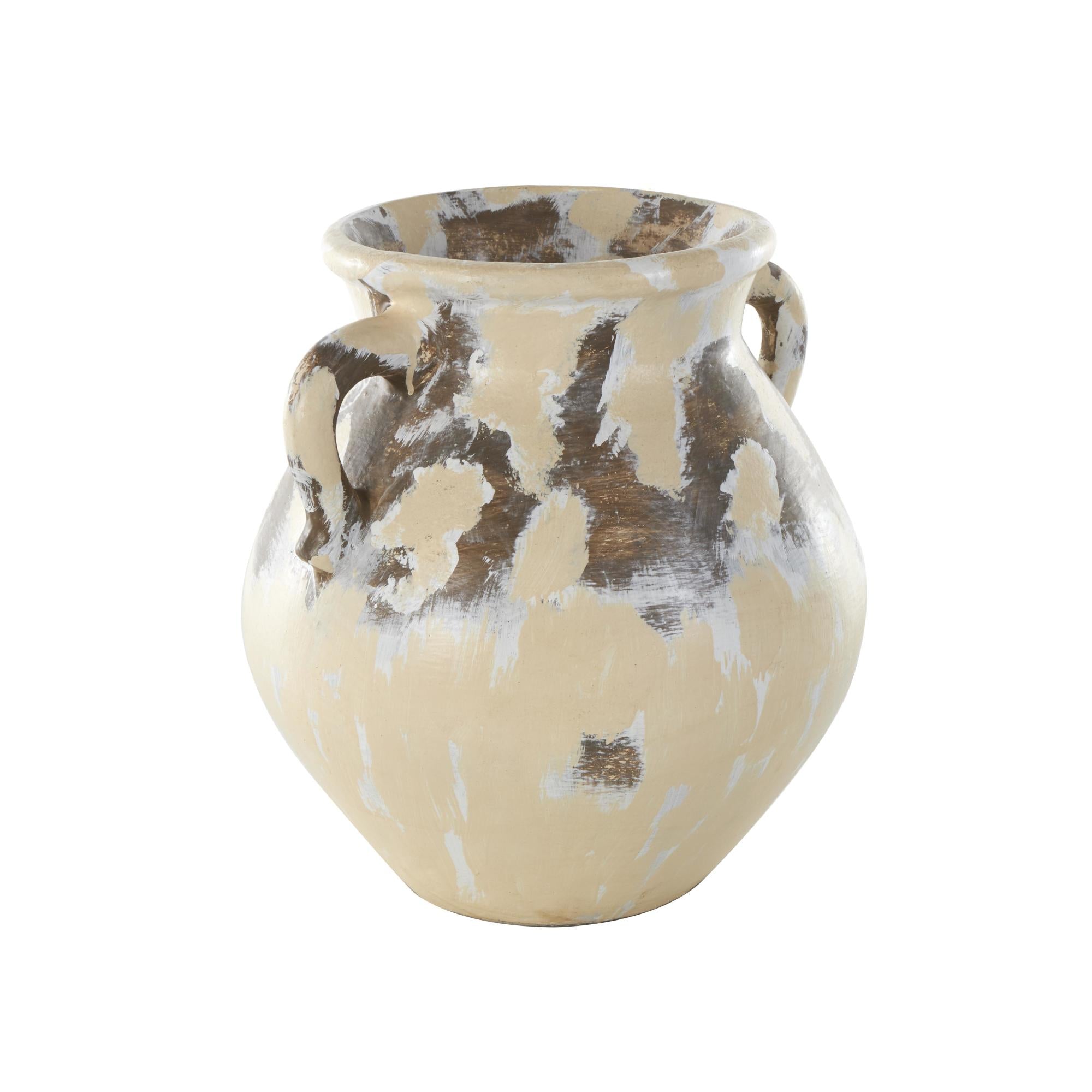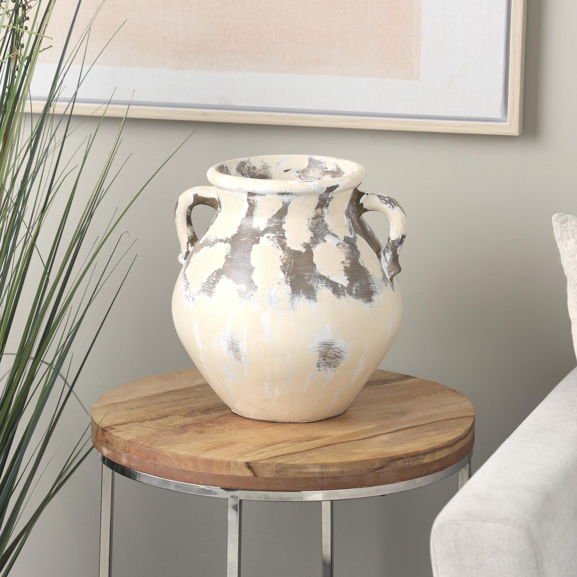 •Distressed vase for dried flowers has a round-shape with two arched handles and a distinct distressed pattern that will look great in any room of the home