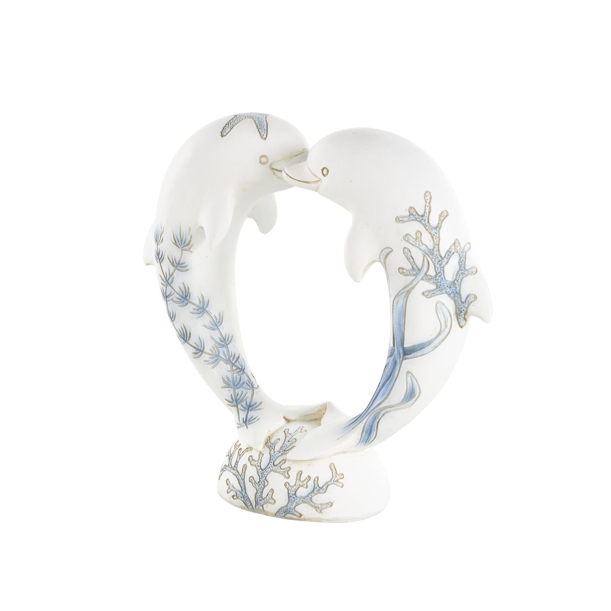 Dolphin White Polystone Heart Shaped Decorative Sculpture with Blue Coral Patterns