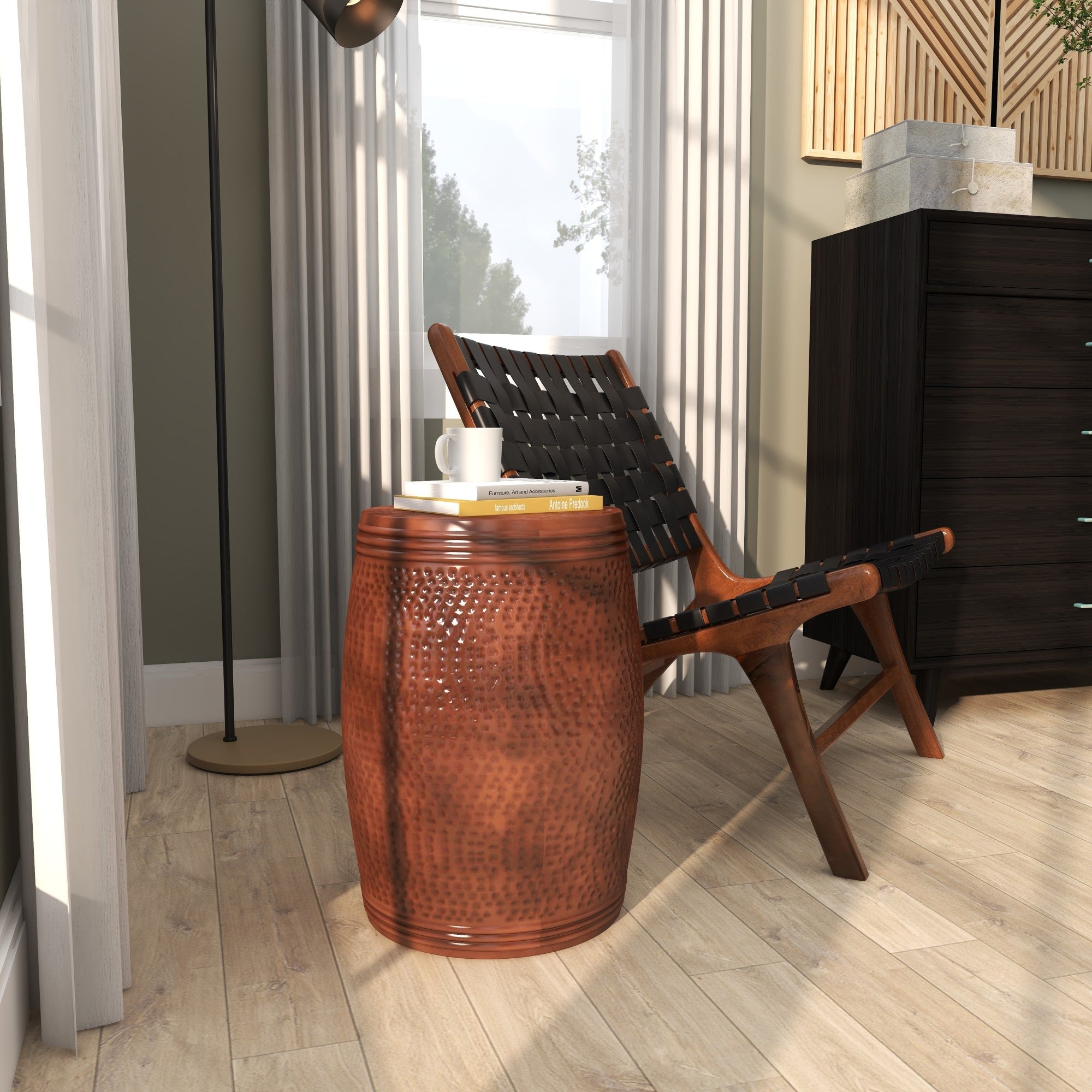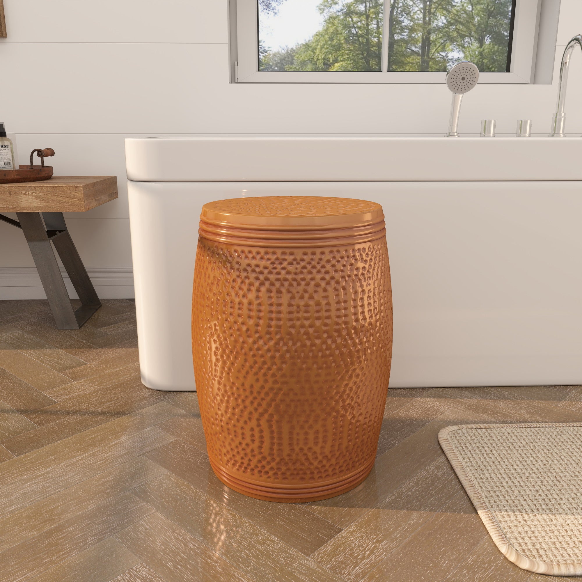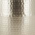 •The iron accent table features a hammered design on its exterior, with fluted detailing near the top and bottom, and a slight concave center for secure display of items