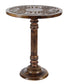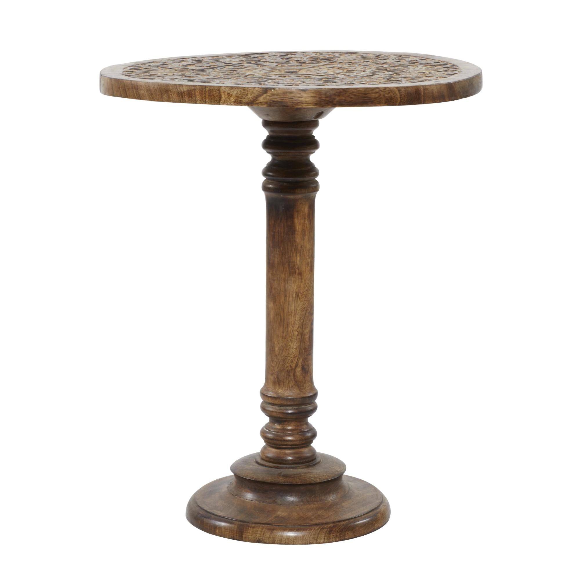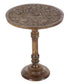 •The mango wood accent table is distinguished by its intricate elephant carvings on a turned wood style pedestal base, adding an element of delicacy to its robust structure