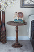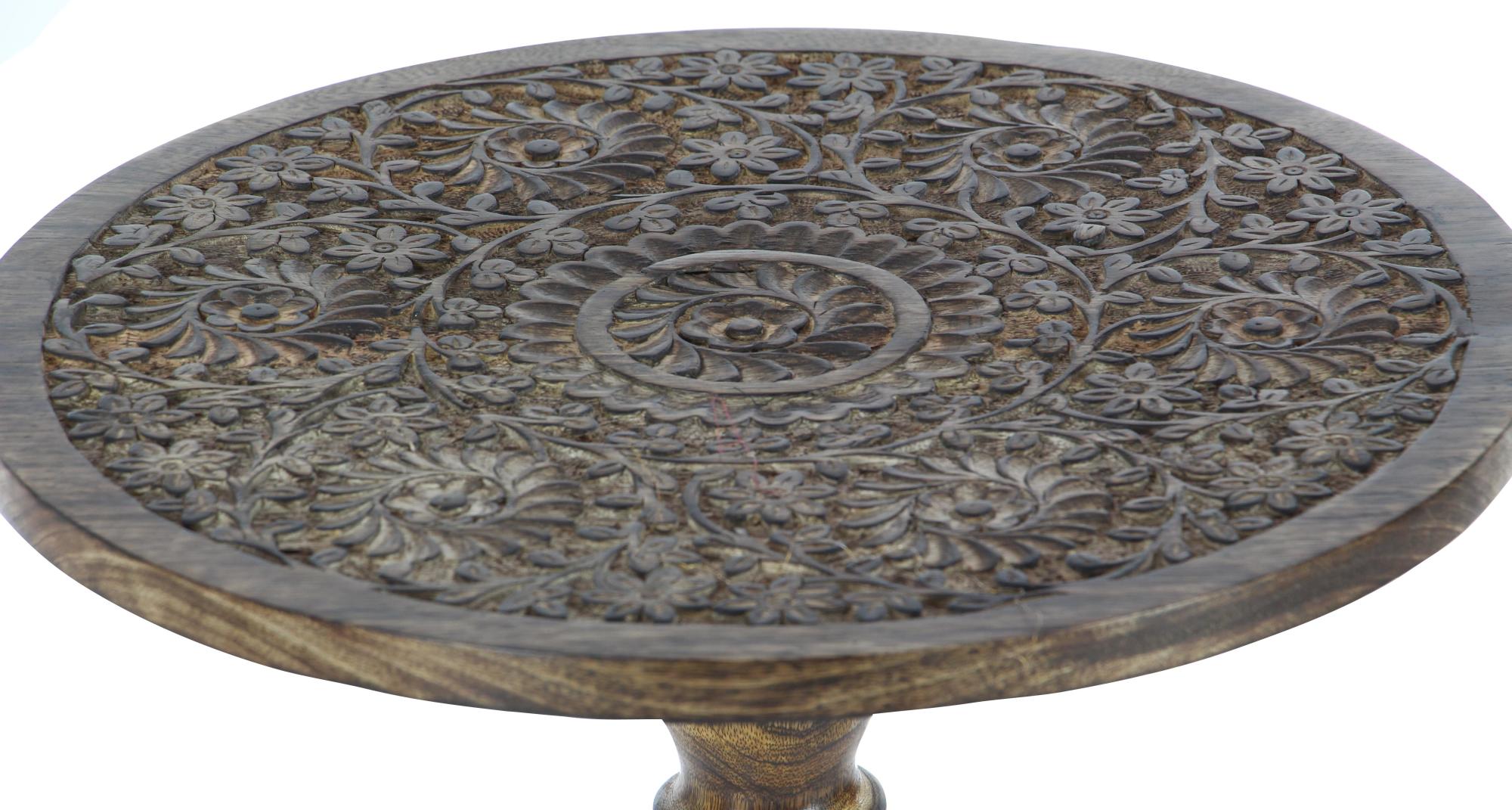 •The round top of the traditional small table is carved and affixed to a single pedestal leg, showcasing exceptional craftsmanship