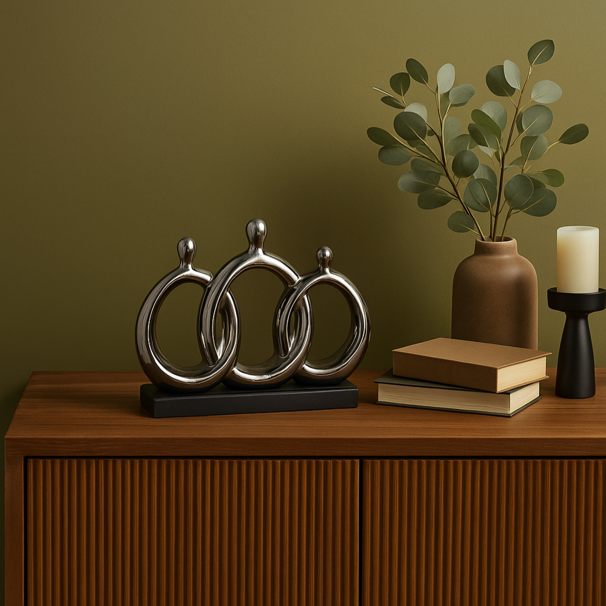 •Glossy home decor figurine's round abstract shape and rectangular base making it a captivating addition to any decor scheme