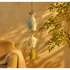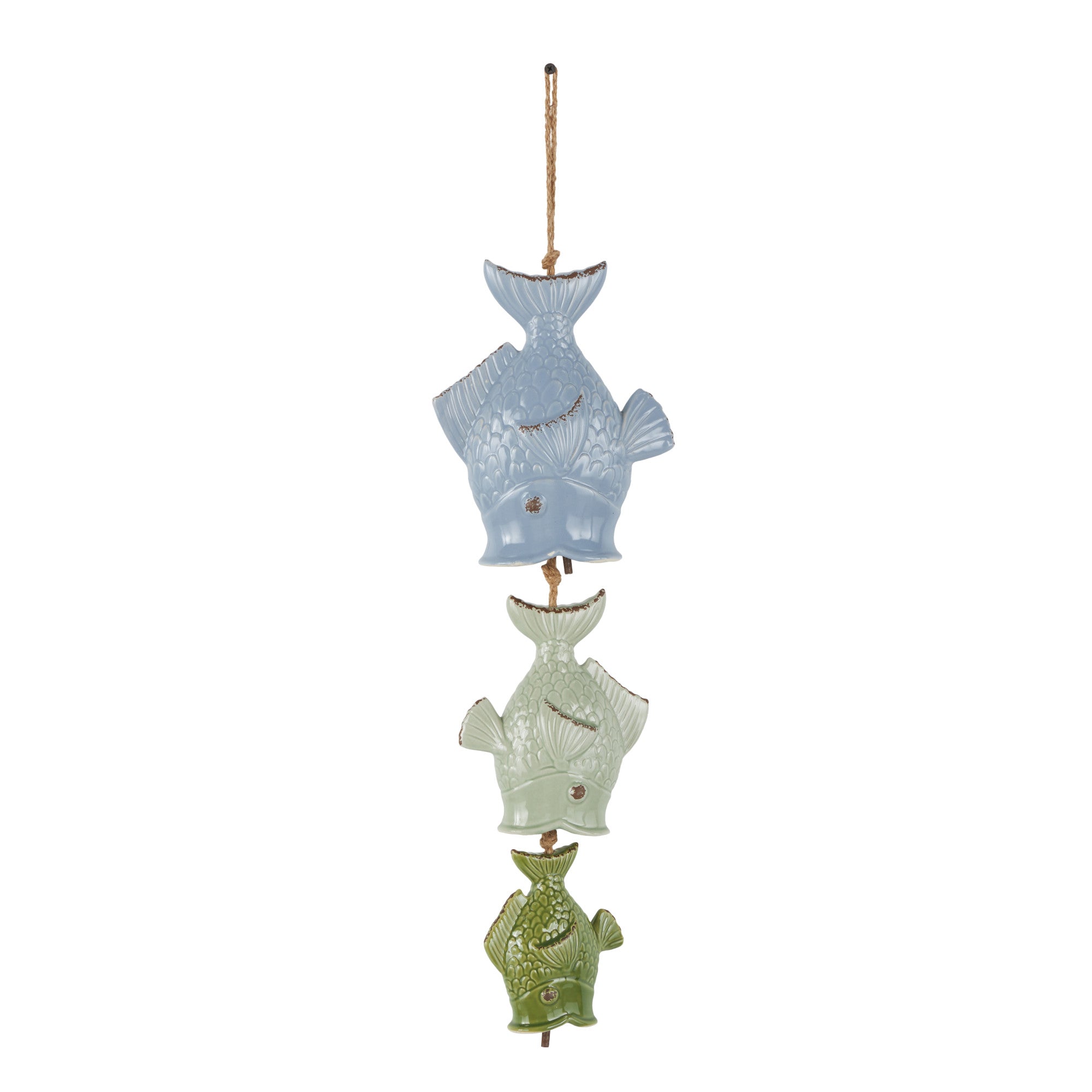 •This ceramic windchime showcases three fish figures and a rope for hanging, adding a coastal touch to any setting