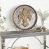 •This iron decorative charger for table features a round profile with a detailed fleur-de-lis embossed at the center, adding a touch of classic charm