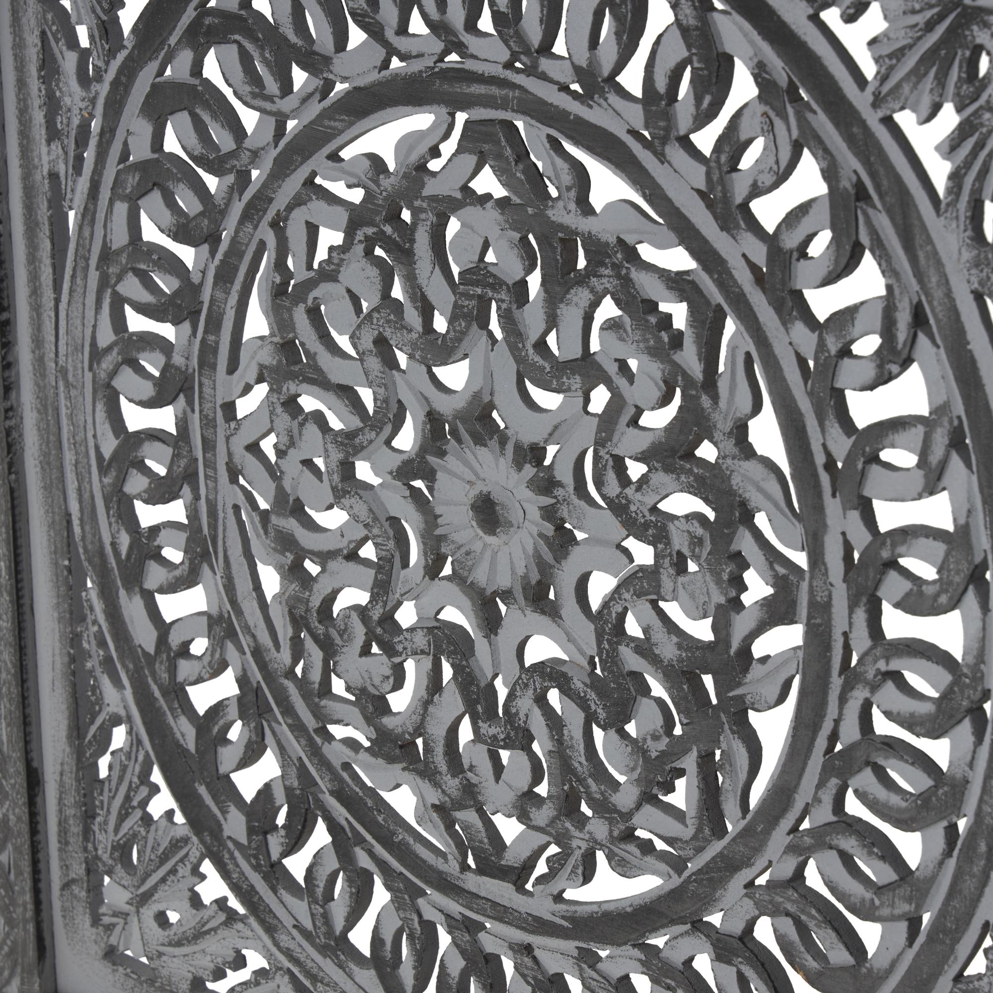 •Oiled room divider panel stands out with its rectangular shape, unique circular cut-out pattern, and floral center carvings, bringing both function and aesthetic appeal to your space
