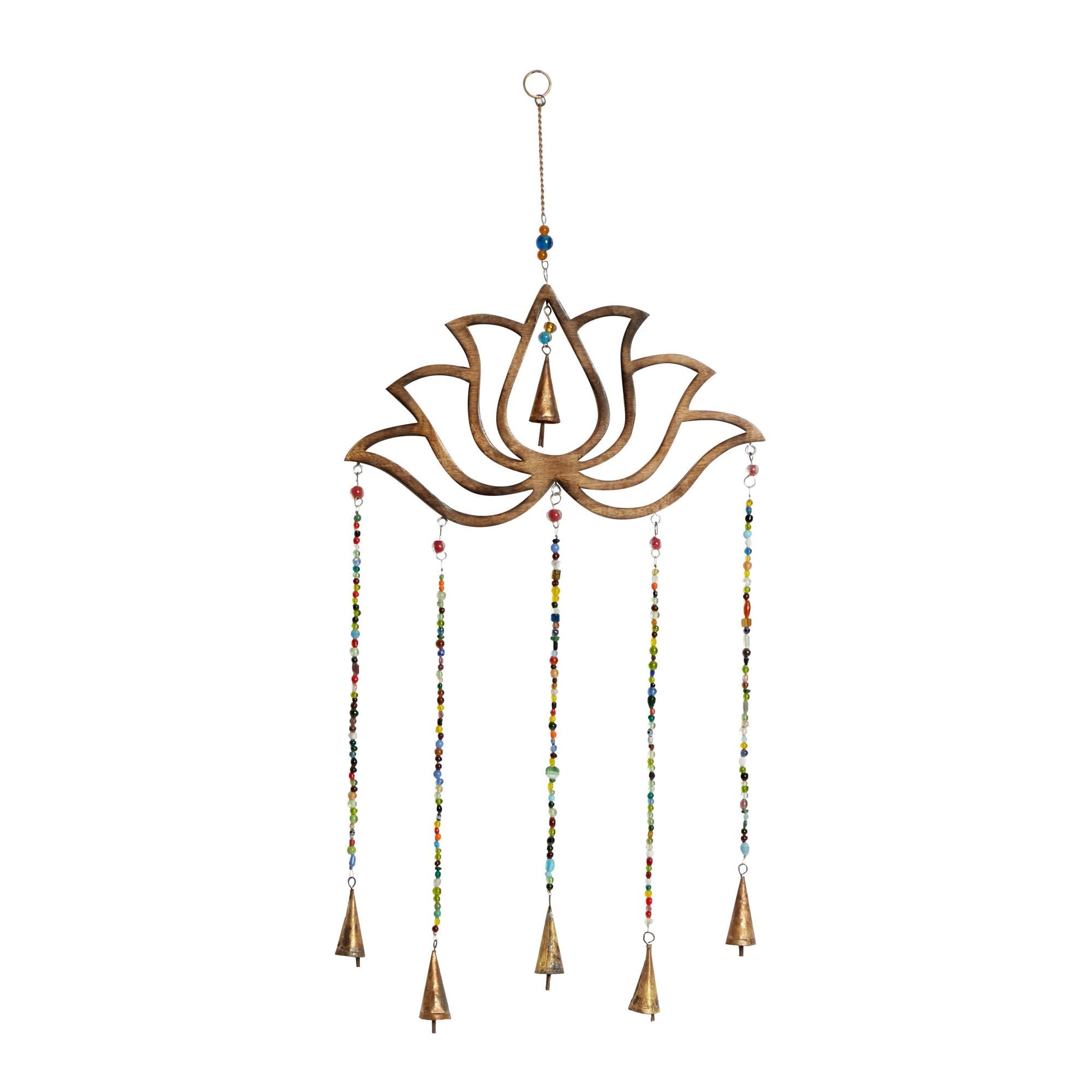 •This eclectic wall art windchime is carved from mango wood to form a lotus design, adorned with welded iron bells and molded glass beads