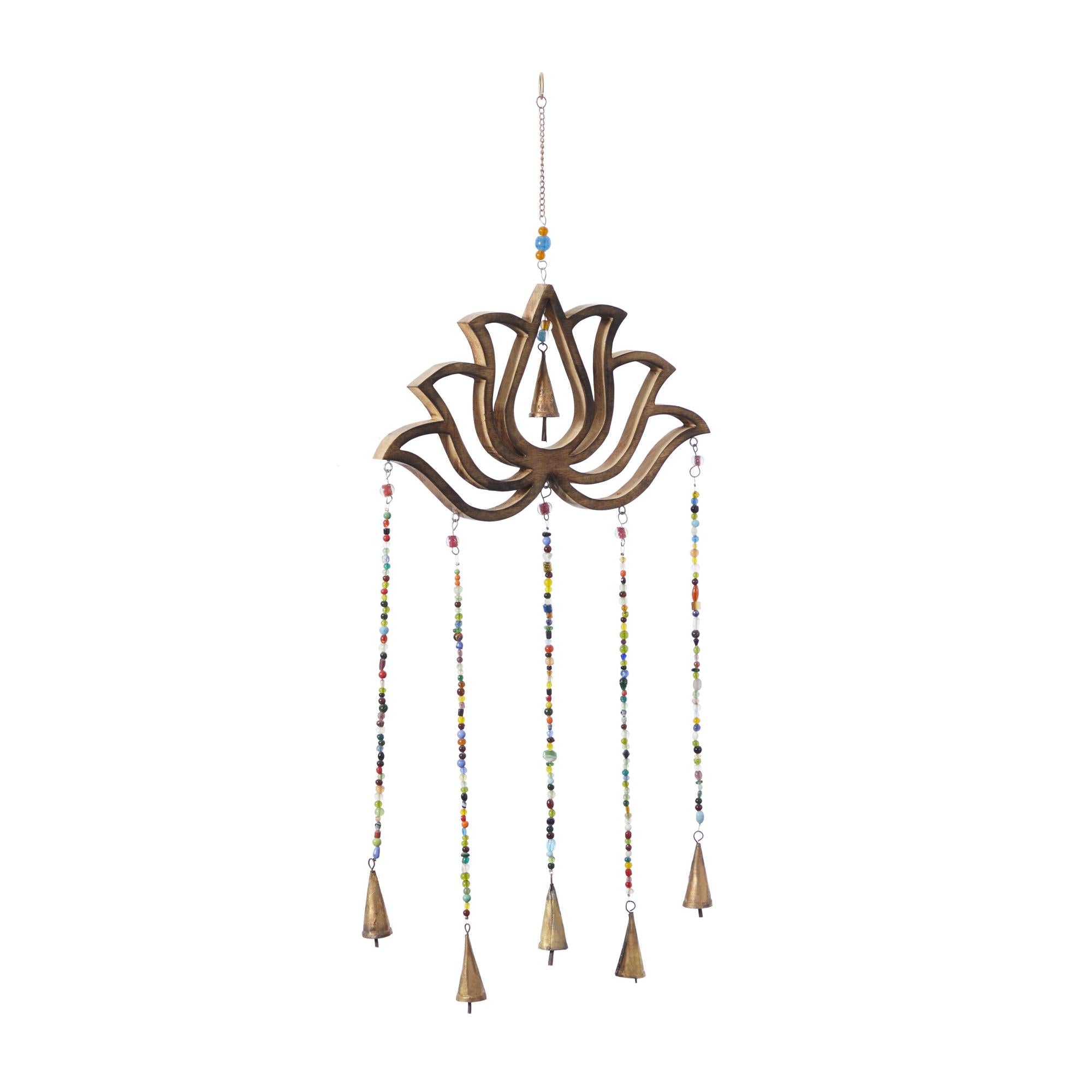 Floral Brown Mango Wood Handmade Lotus Indoor Outdoor Windchime with Glass Beads and Cone Bells