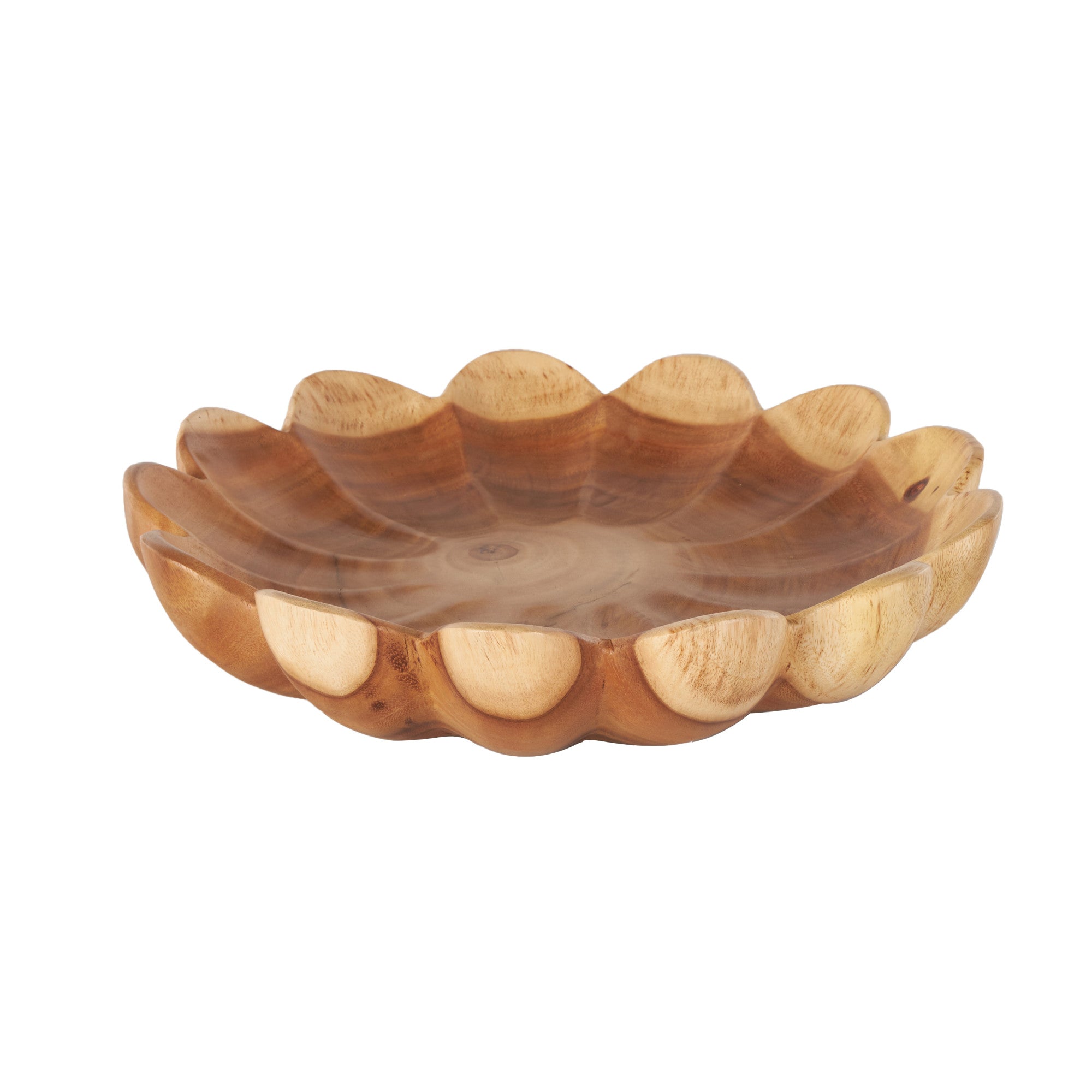 Floral Brown Teak Wood Handmade Large Decorative Bowl with Light Brown Tones