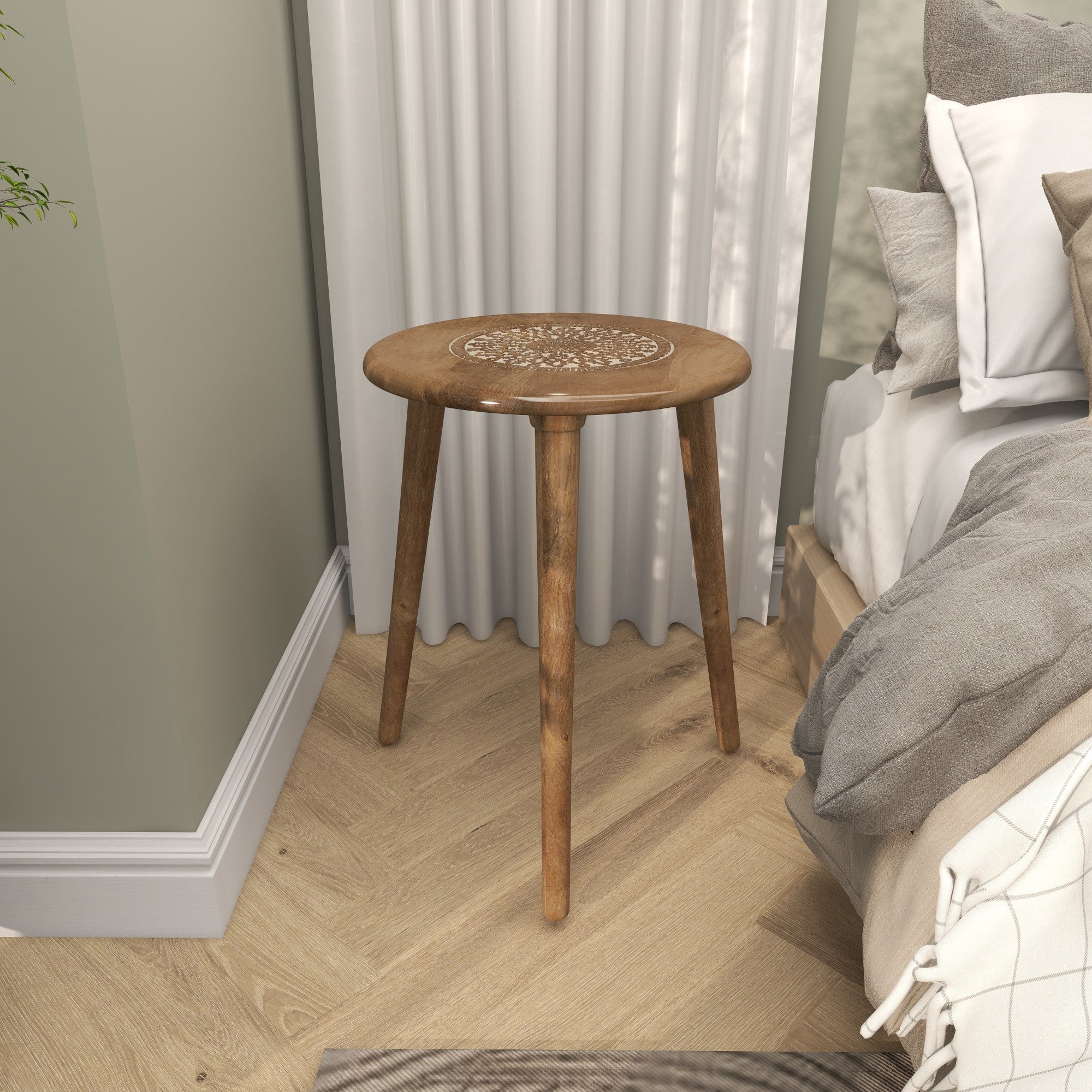 •The mango wood accent table features delicately carved floral and trellis patterns on slender legs, adding an intricate touch to its design