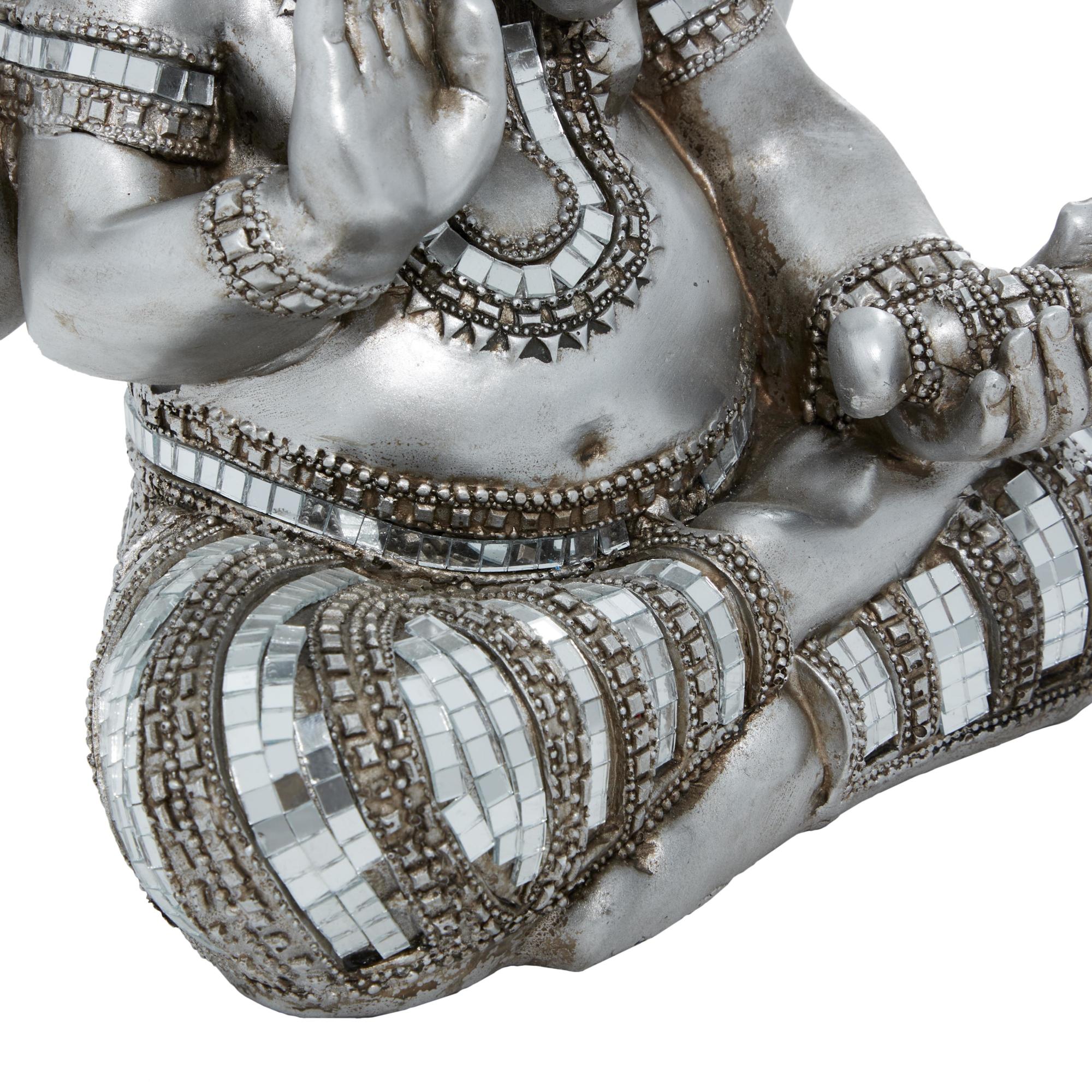 •Satin home decor figurine showcases Ganesh with intricate tile-like mirror accents and relief detailing