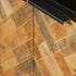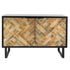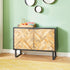 •This contemporary cabinet storage showcases crafted wooden mosaic panel doors attached to a robust metal frame that extends to leg stands