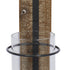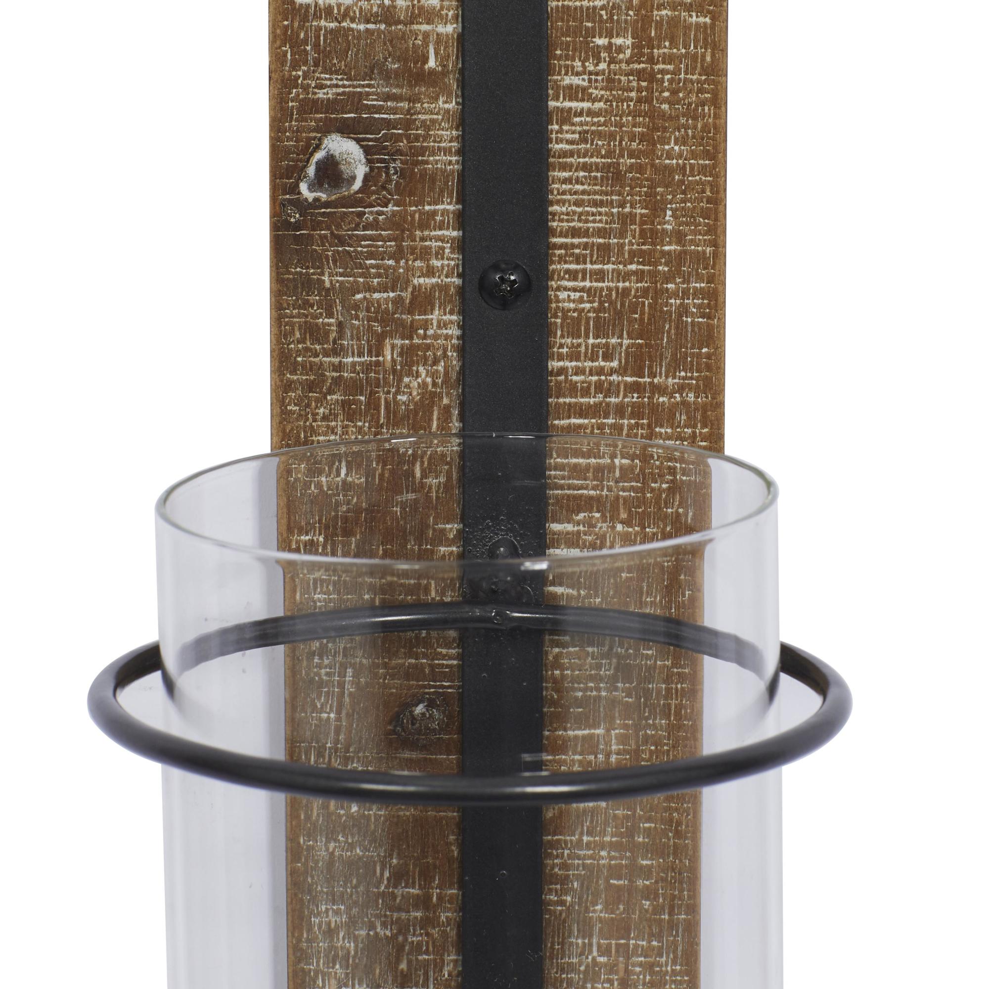 •The contemporary wall mount candle holder features a carved wooden backing furnished with a welded iron frame and molded glass cover