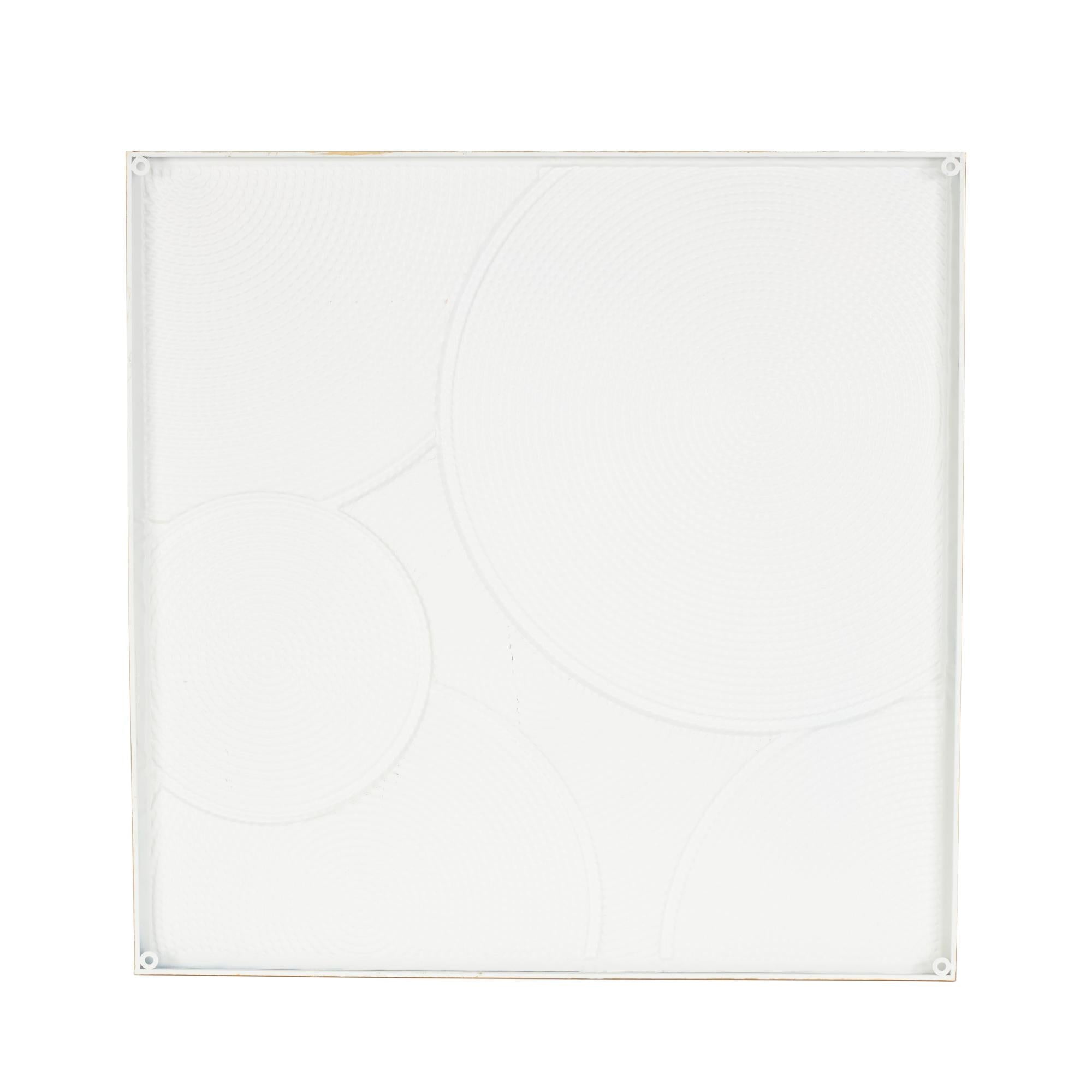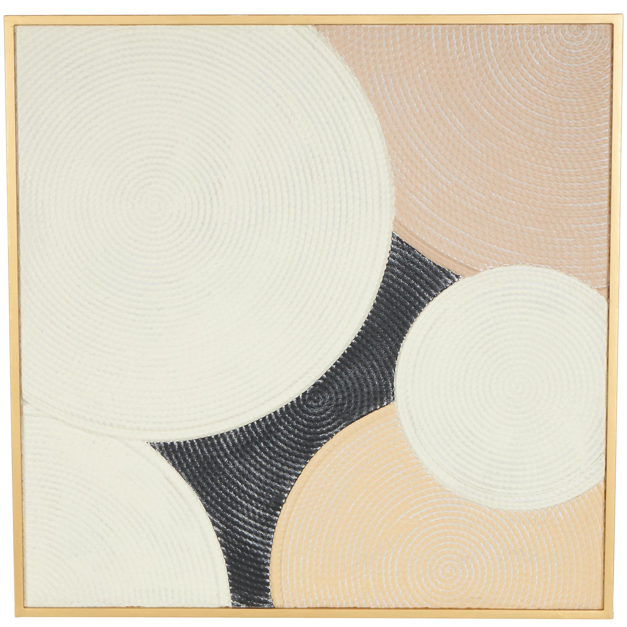 •This textured wall framed art highlights a square canvas with overlapping circle patterns