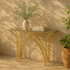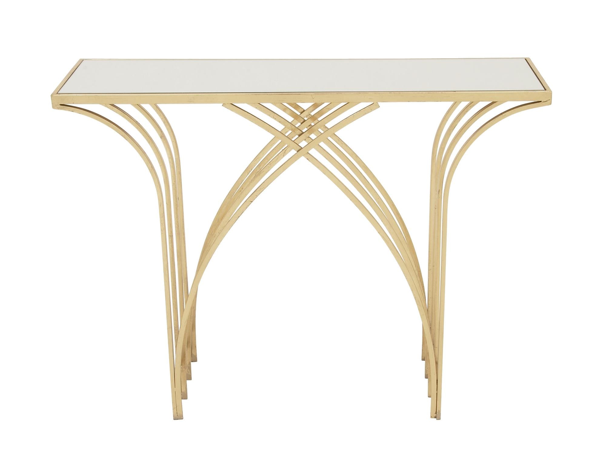 •This iron console table showcases a spacious mirrored top with curved vertical bars forming a striking funnel base structure
