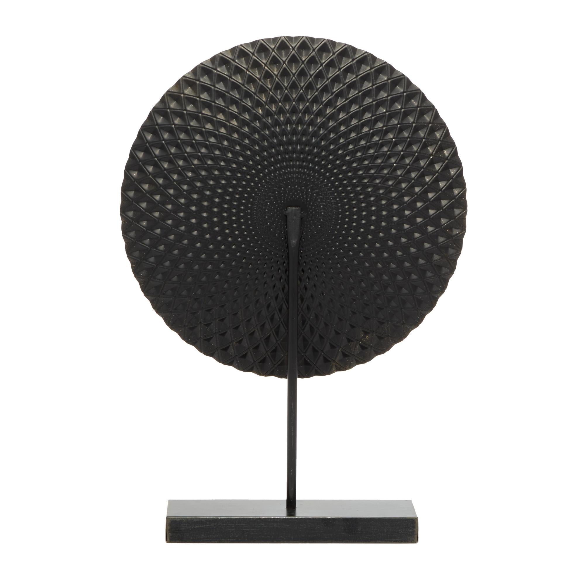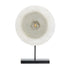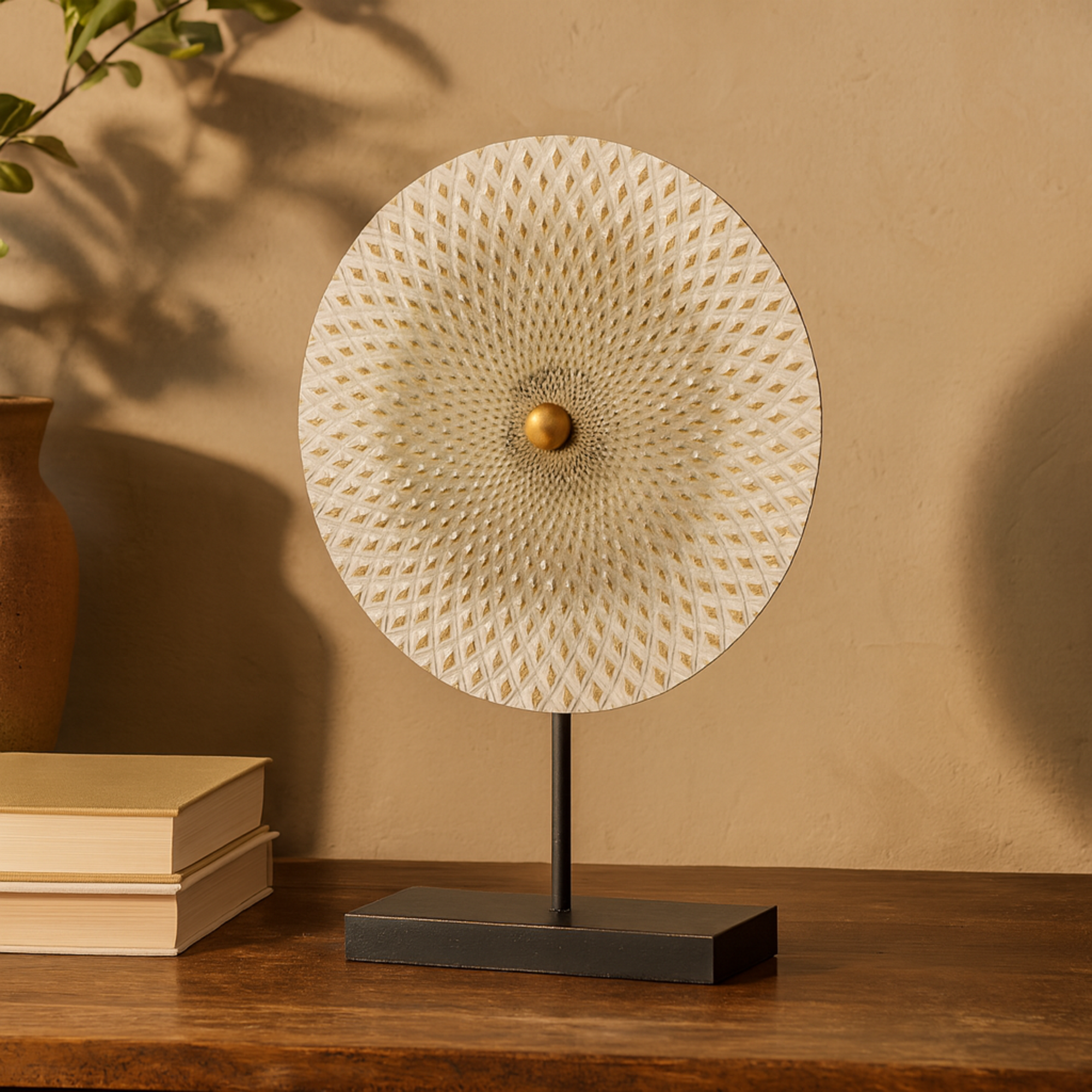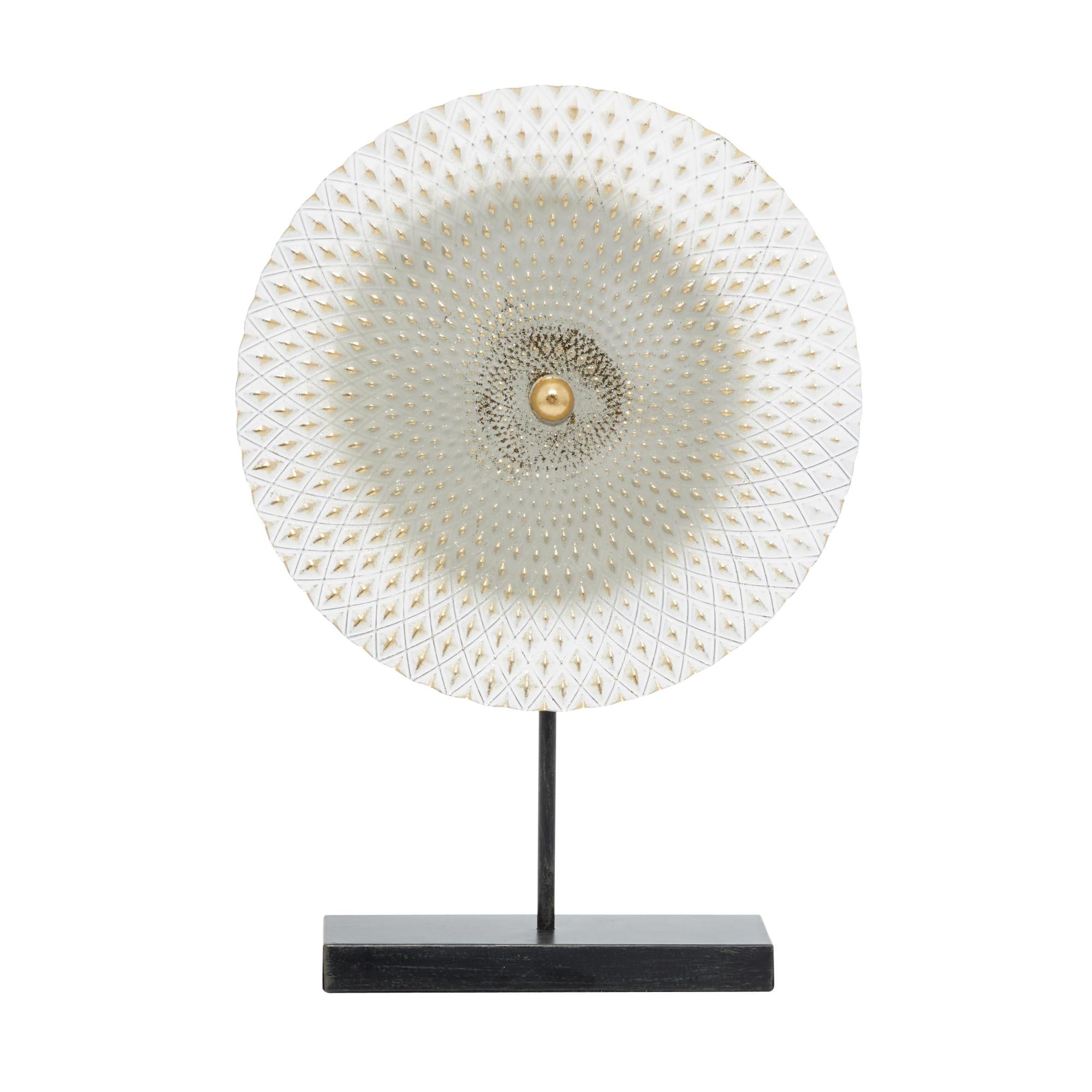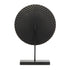 •Contemporary accent statue is constructed by welding metal into a round disc figure attached onto a sturdy metal stand