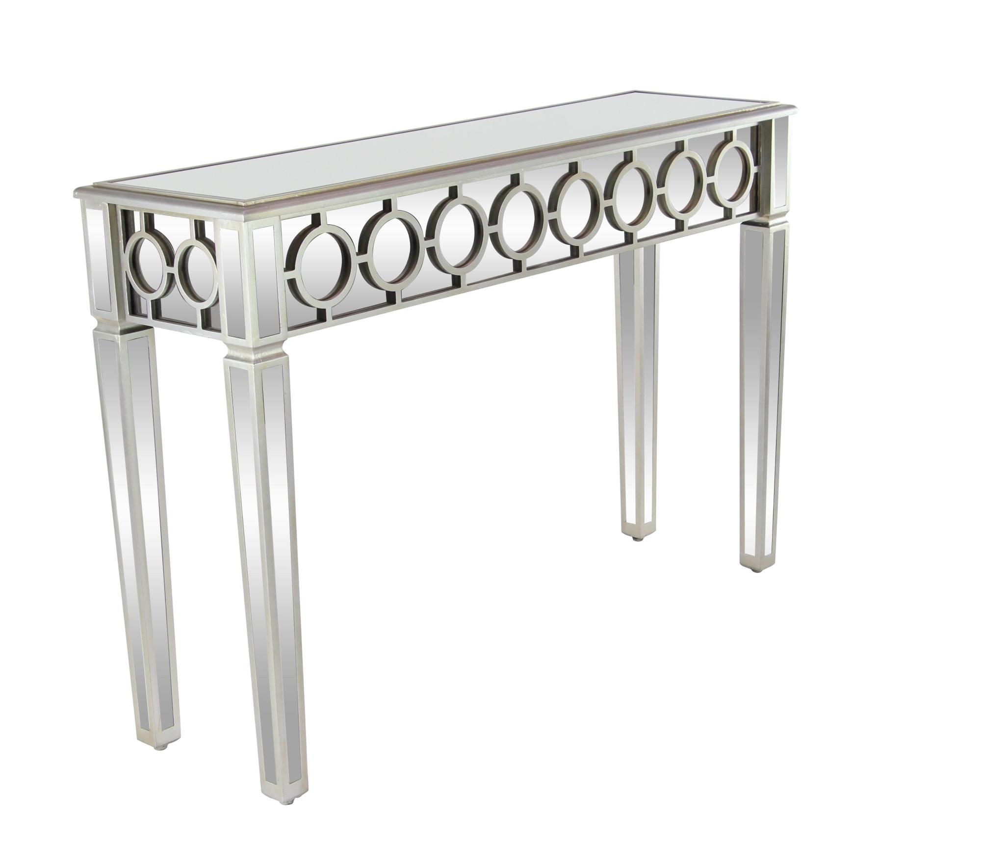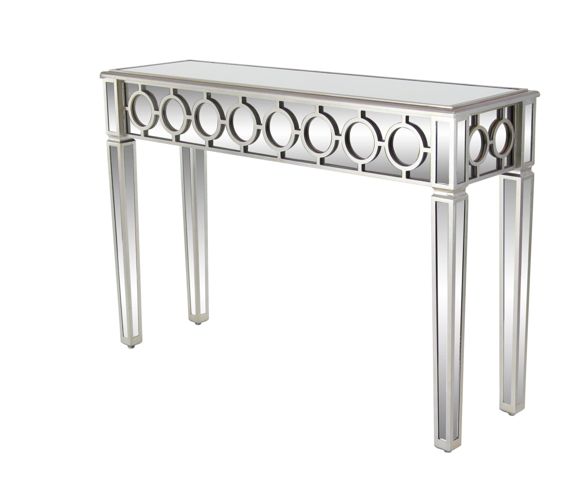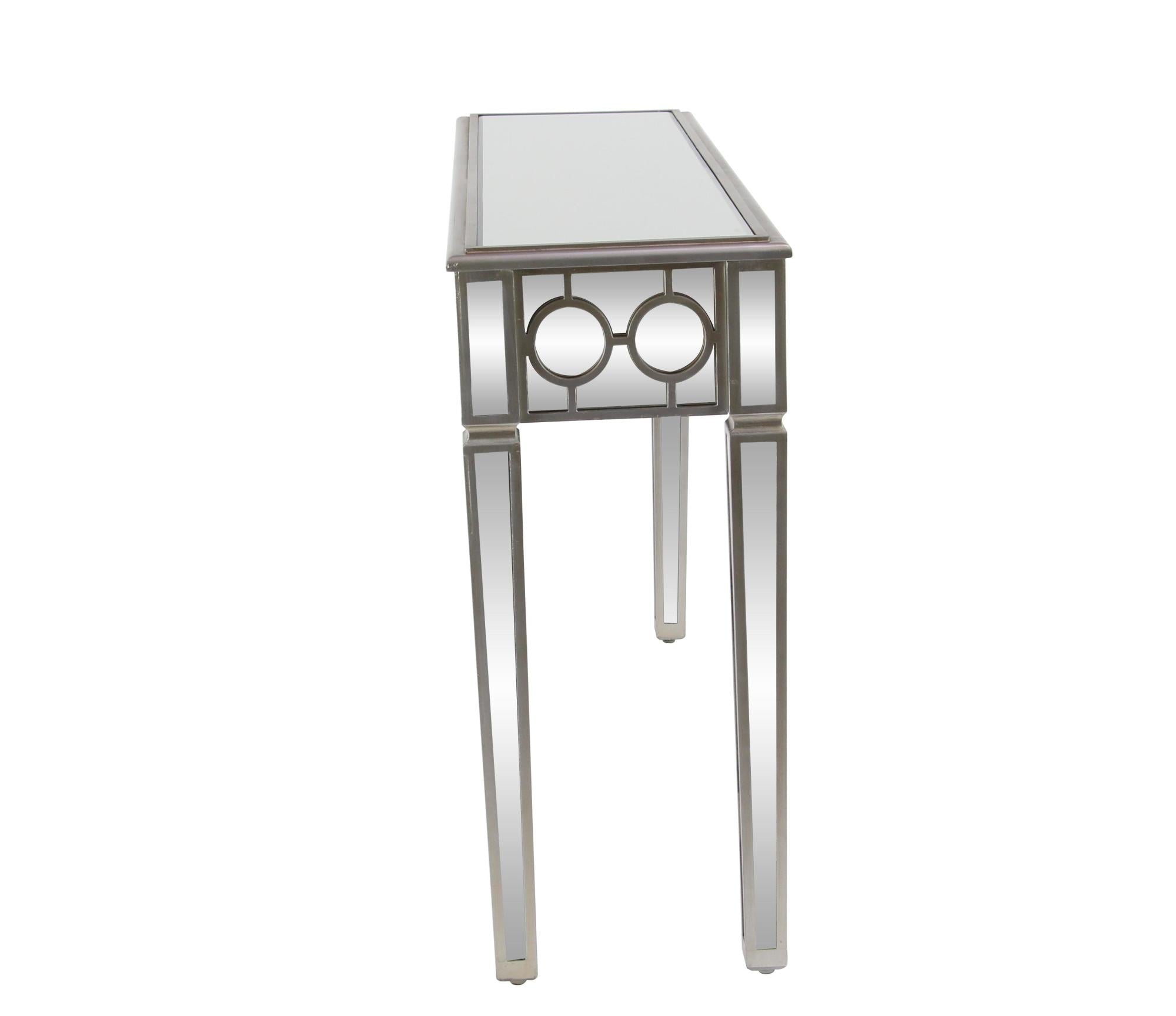 •This glass console table features circular cut-out overlays on the mirror paneling that offer a luxurious display