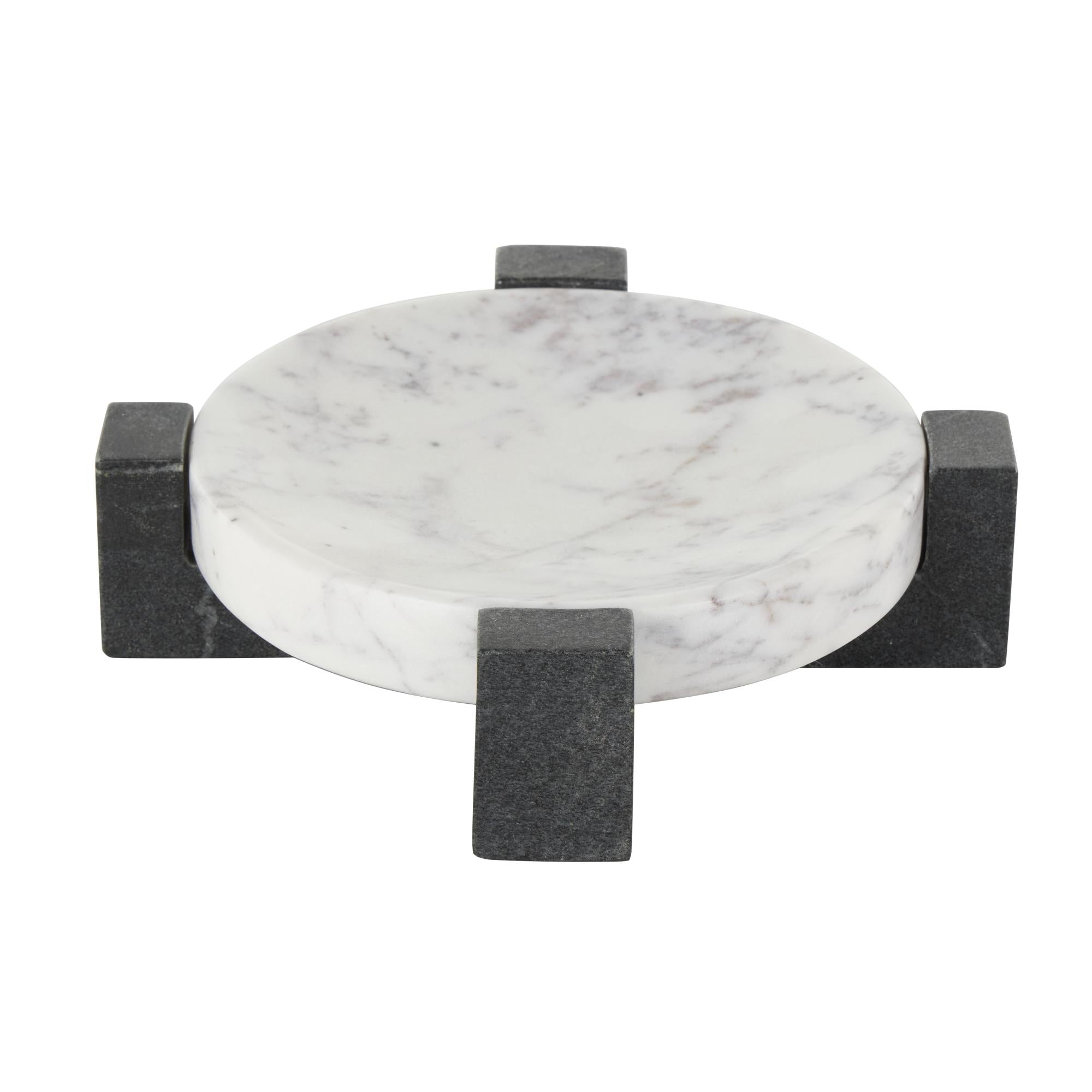 •The matte storage tray stands out with its distinctive round shape on an X-shaped base with elegant marble veins, offering a contemporary twist to traditional trays