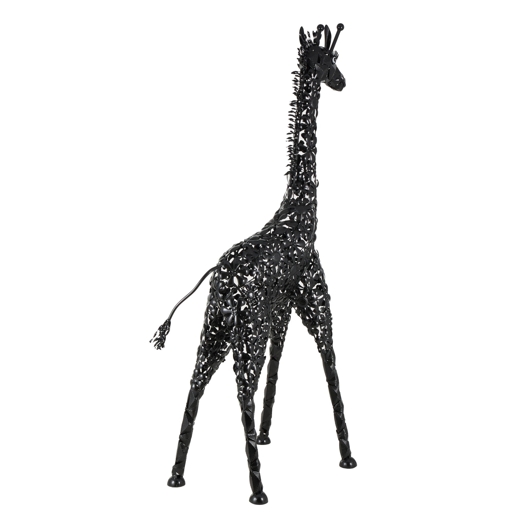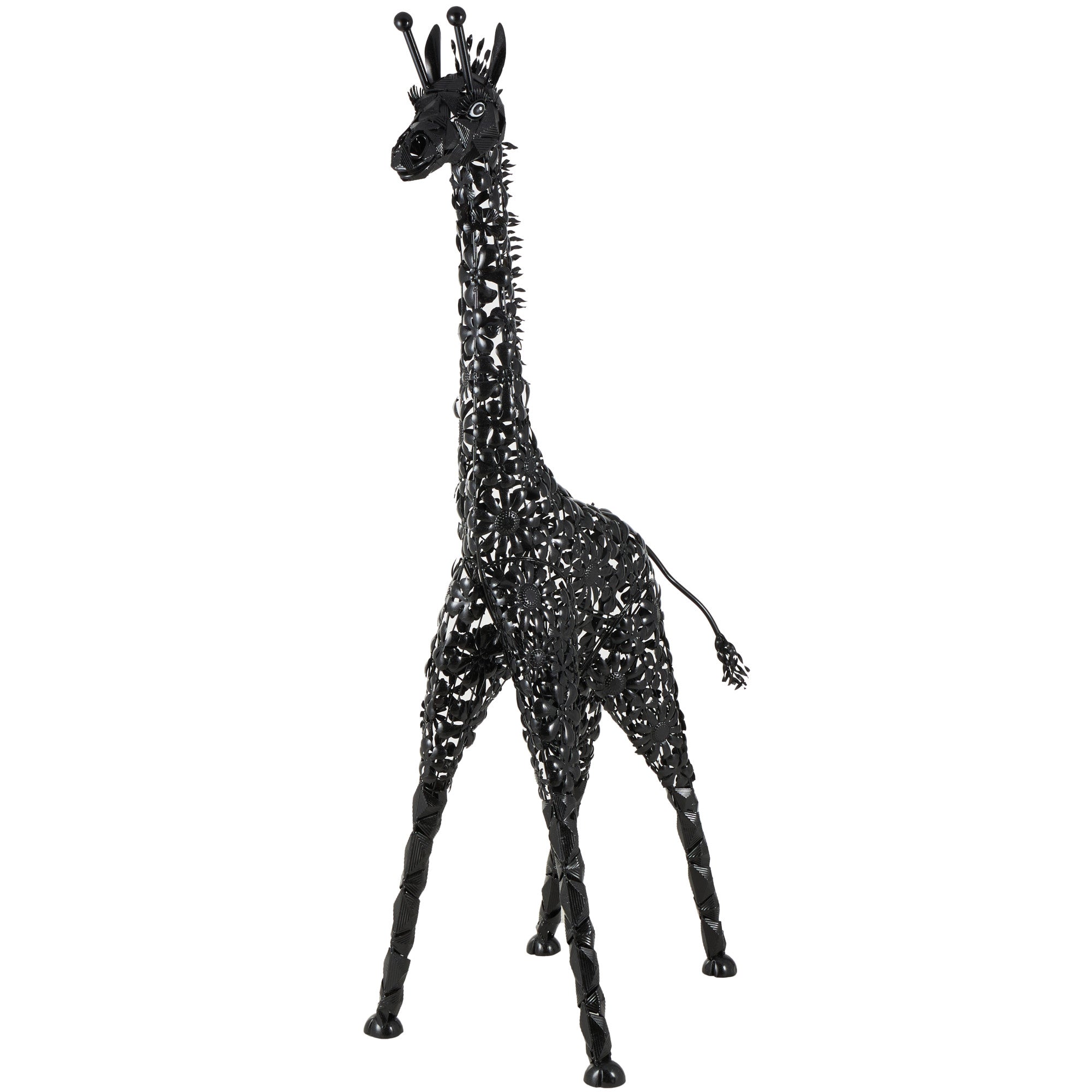 •Each piece of iron in this eclectic garden decor sculpture has been meticulously welded together to form a giraffe figure and a captivating cut-out floral design