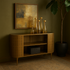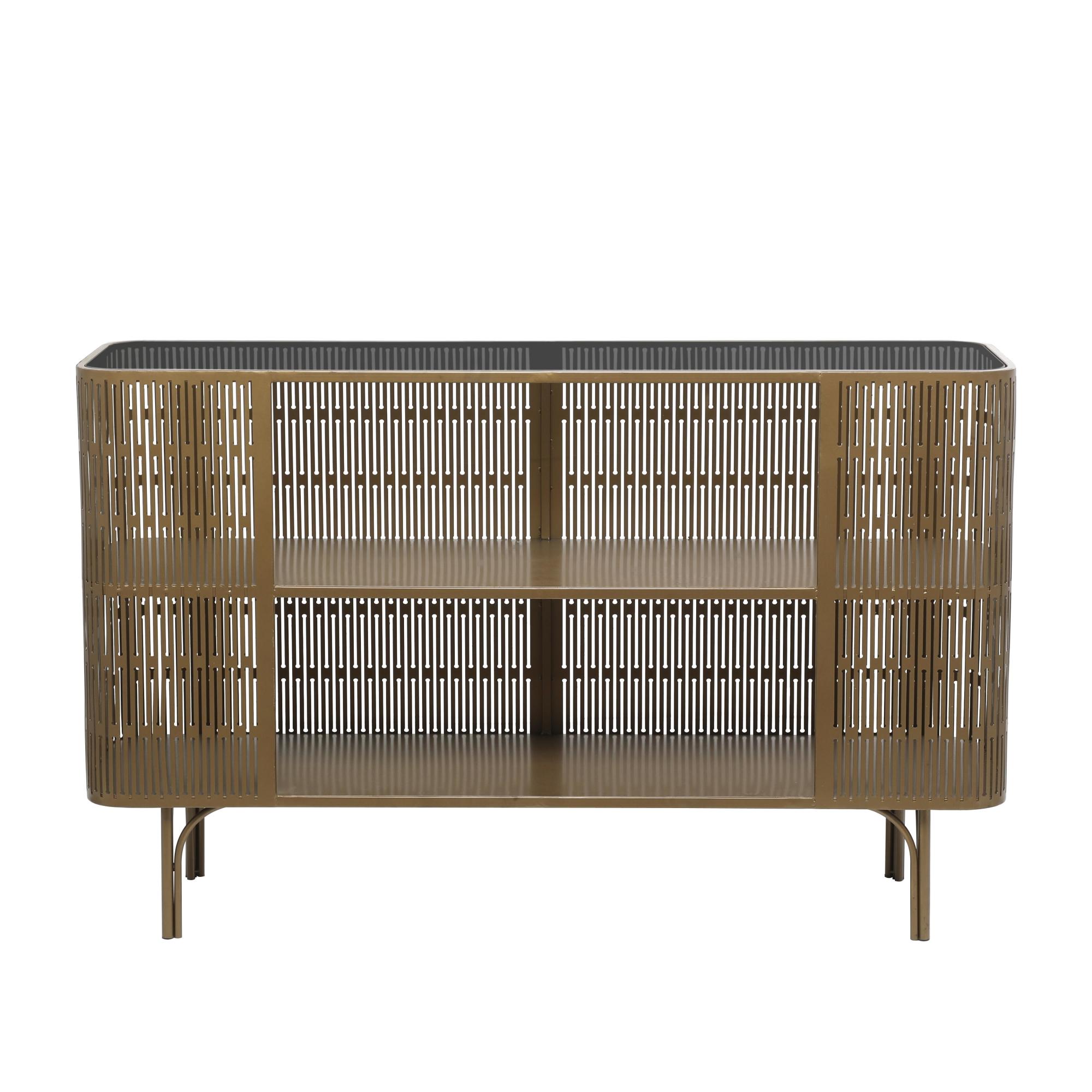 •This metal console table boasts clean lines and an open design, offering spacious shelving
